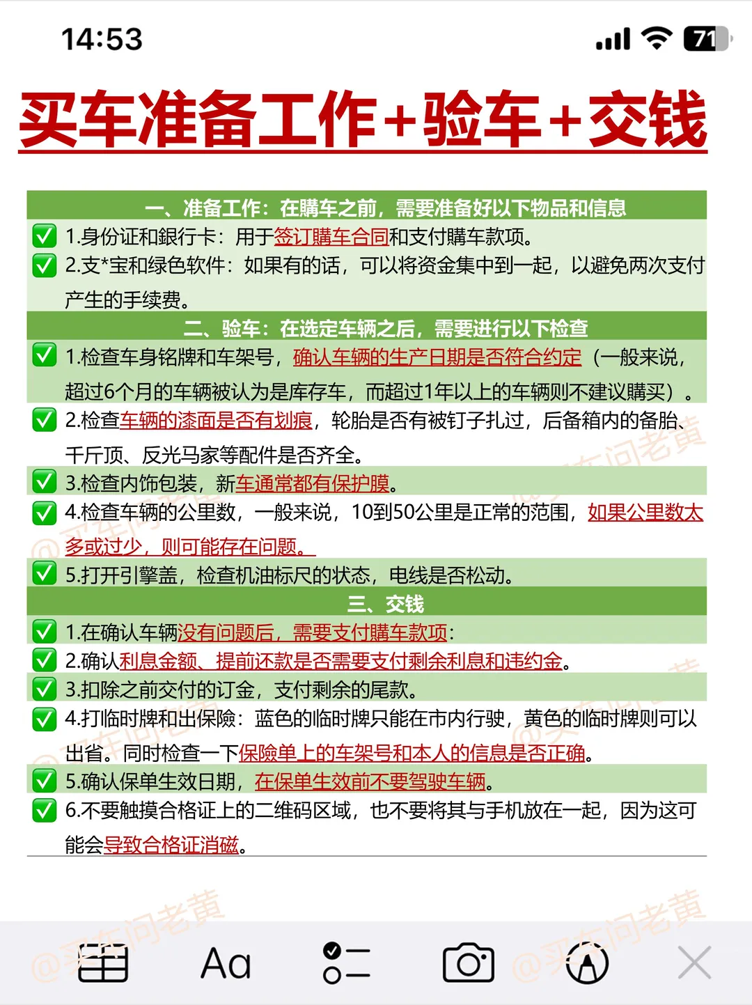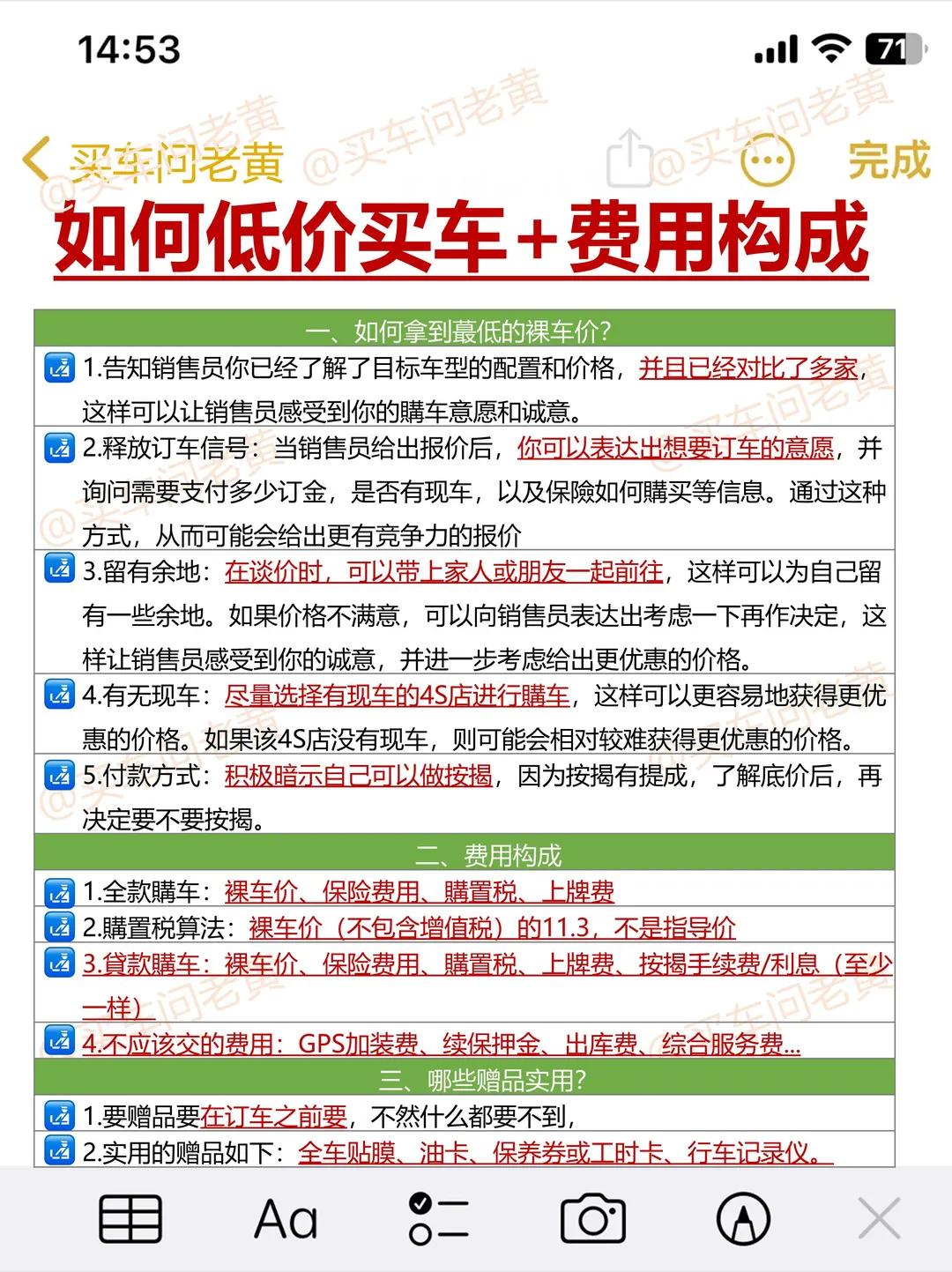 家人们谁懂啊!谈好的15万落地,签合同秒变18万?!千万别笑,10个买车9个被坑,看完这篇直接捂住你钱包!👛 💥 手把手教你避开7个大坑,省下半年奶茶钱! 1️⃣ 裸车价都是烟雾弹! 销售说直降3万?别急着乐! 先扒拉下车友群真实成交价,砍价从【指导价】往下砍,别信他的“优惠后起步”! 2️⃣ 保险别傻白甜!(4S店最黑一环) ✔️车损险按【发票价】算!别被按指导价糊弄! ✔️只买三样:交强险+车损险+三者险(300万够用) ⚠️第一年保费敢收你1万?反手直接打给保险公司问价对比! 3️⃣ 购置税自己算! 记住这个数:裸车价÷11.3 销售要是说“按指导价交税”?马上录音!12315见! 4️⃣ 车船税别多给! 1.6升以下:360块/年 1.6升以上:660块/年 别信他忽悠“都收500”,咱依法交! 5️⃣ 上牌费别当冤大头! 自己去办:120元+半小时 4S店代办超过500?拜拜了您!(临时牌自己打,10块钱!) 6️⃣ 贷款套路深似海! 手续费超过3000?直接对半砍! 年化利率超过5%?赶紧跑!借10万还13万真不值! 7️⃣ 提车不验=白送钱! ‼️这几处必查: ✅轮胎日期(比整车生产还早?退!) ✅玻璃上的编号(点点要对齐) ✅排气管抹一把(有黑灰正常,发白可能是泡水!) ✅仪表盘里程>50公里?问题车实锤! 🌟总结:进店别冲动,合同每个字都要抠! 别让销售牵着鼻子走,你是金主你说了算! 如里您觉得有用,请👍➕🌟, 买车一定用的上! ✔️✔️✔️✔️✔️✔️✔️✔️✔️✔️ 老黄从事汽车行业10多年 买车用车关🐷老黄: 买车避坑 可全国邦提车 给底价 用车技巧