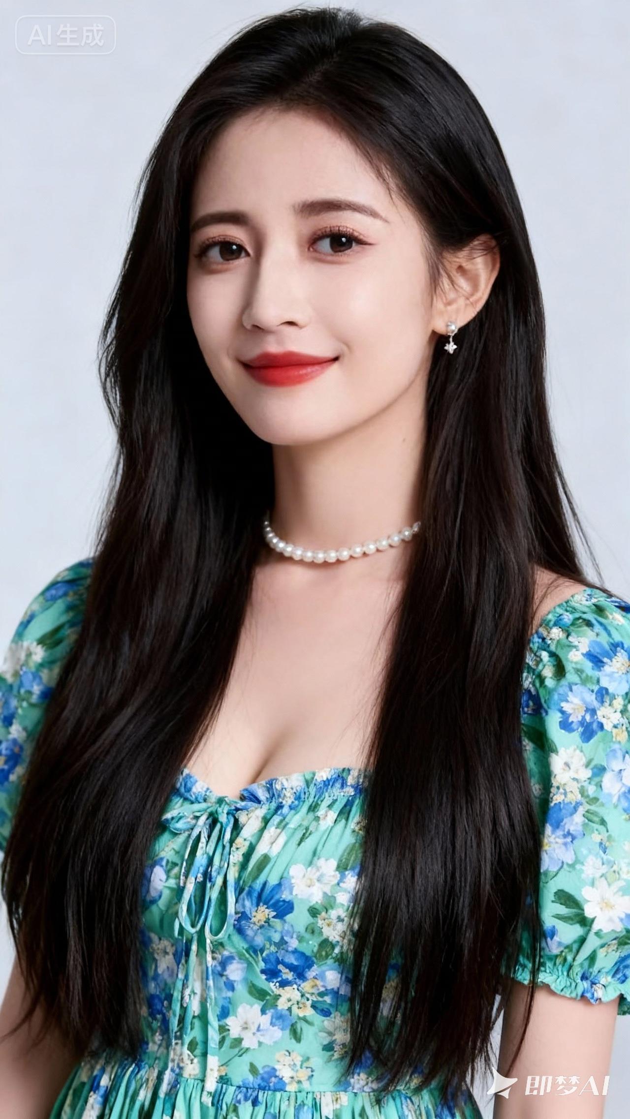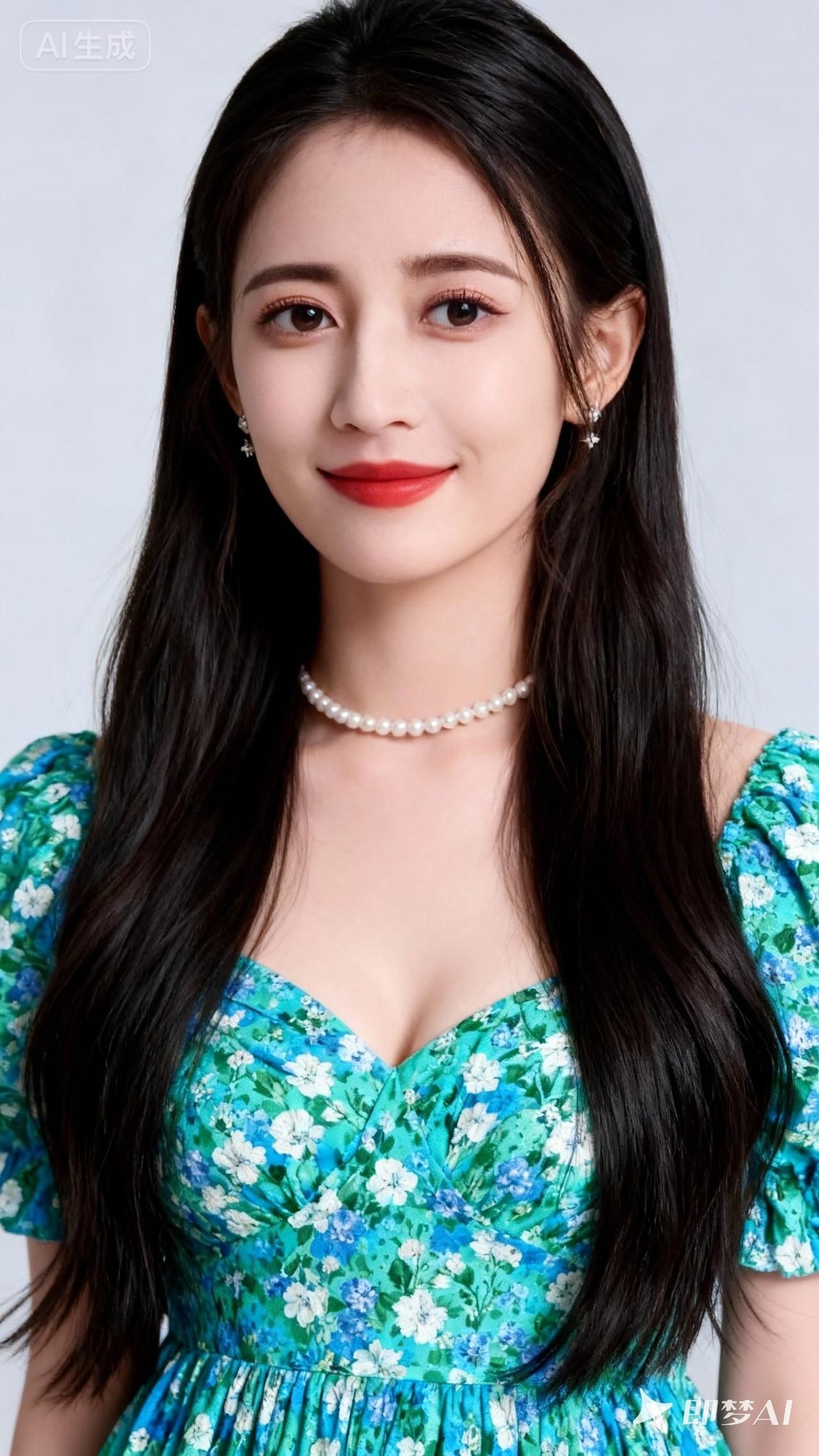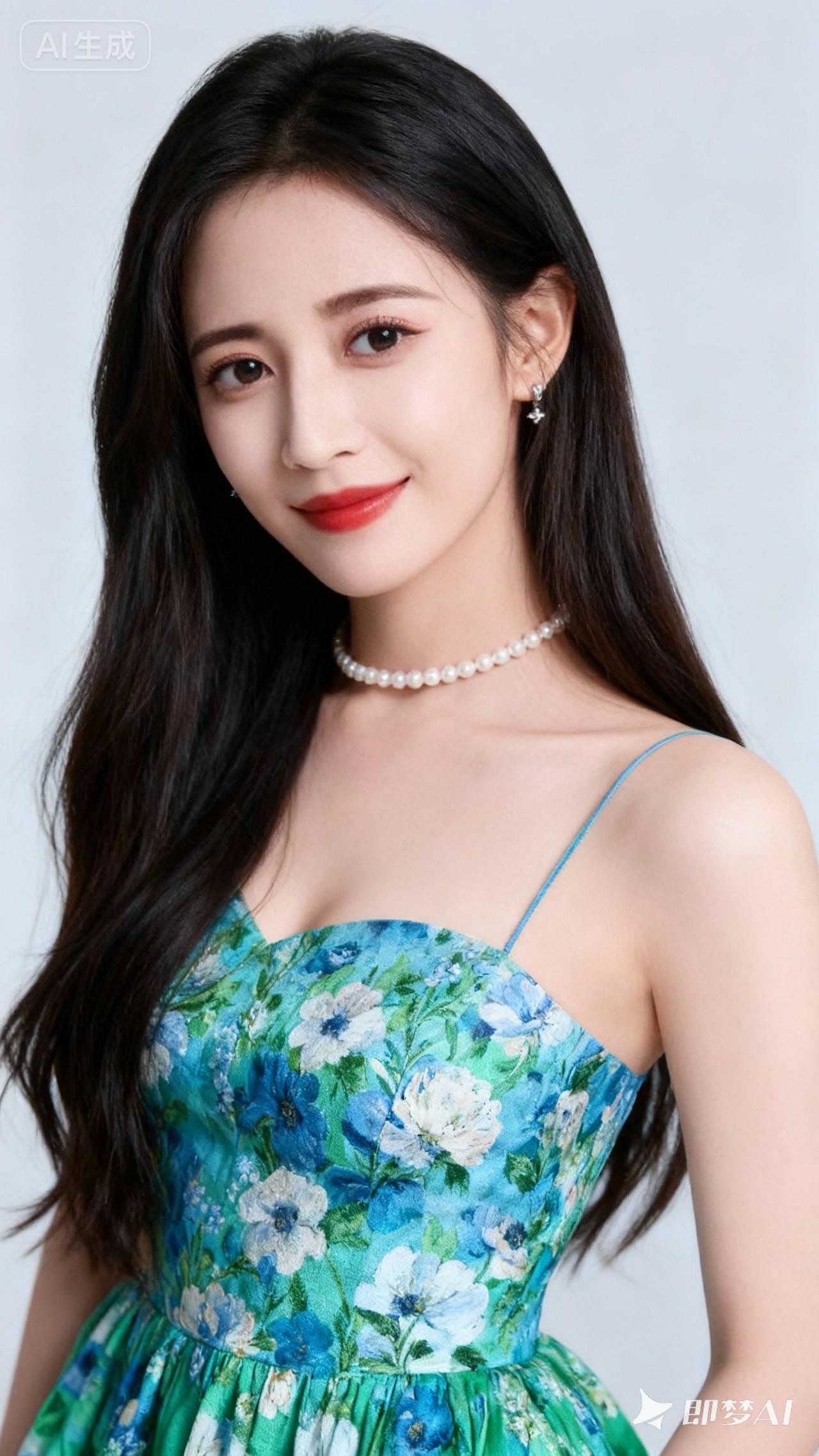 优雅蓝花裙,珍珠项链点缀,甜美笑容,尽显女性魅力!