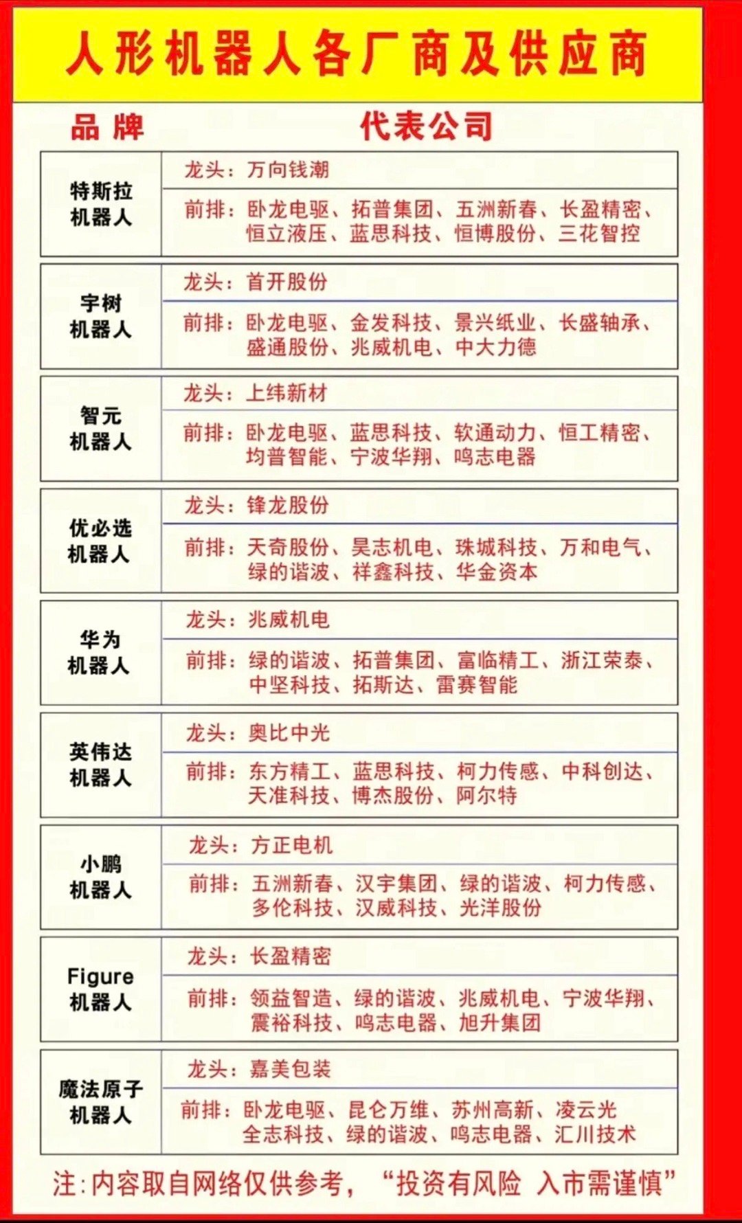 人形机器人各厂商及供应商!春晚概念:机器人、人工智能AI,大概率会有所表现。相关