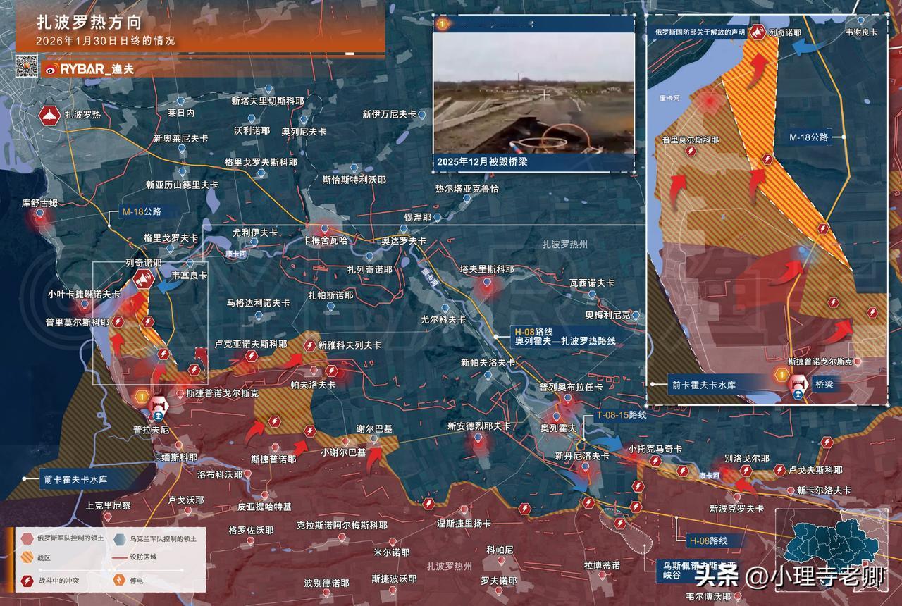 2026年01月30日日终的情况 在扎波罗热方向,俄罗斯"第聂伯"集团军继续向扎波罗热市方向进攻,目前正向孔卡河一线突进。俄国防部宣布解放了列奇诺耶的定居点,该地位于普里莫尔斯科耶稍远处,毗邻斯捷普诺戈尔斯克—扎波罗热公路及一座现已损毁的大型桥梁。 目前尚未出现该地的客观监控画面,而根据前线报告,邻近的普里莫尔斯科耶内部队超小股突击小组阵地交错混杂,导致俄军无法完全控制该定居点,因此谈论稳固的楔形突进还为时尚早。 📌在普里莫尔斯科耶与斯捷普诺戈尔斯克之间,俄军分队还沿M-18公路取得了进展。俄军分队需切断乌军通往斯捷普诺戈尔斯克的路径。乌军部队仍在通过林带向该地渗透。根据对北部高层建筑的无人机和航空兵系统性打击判断,敌军的渗透行动仍在持续。 ❗随着普里莫尔斯科耶—斯捷普诺戈尔斯克—新雅科夫列夫卡防线的巩固,将有望实现向扎波罗热市方向的更大规模的推进。但在此之前,俄军分队仍需攻占奥列霍夫地区——该地现已成为解放扎波罗热州被占领土部分的主要障碍。 俄乌战争国际观察 来源:RYBAR_渔夫