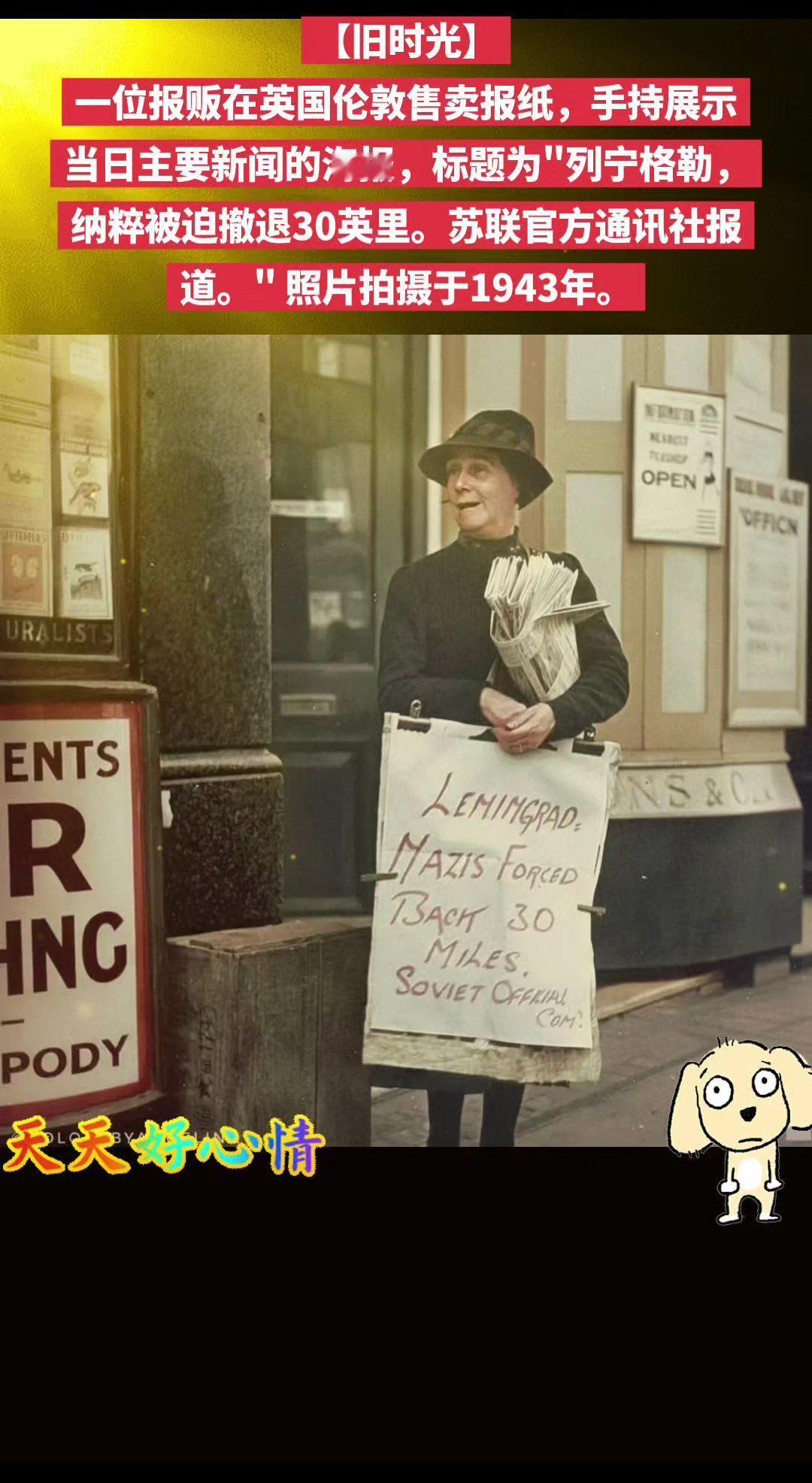 【旧时光】一位报贩在英国伦敦售卖报纸,手持展示当日主要新闻的海报,标题为"列宁格勒,纳粹被迫撤退30英里。苏联官方通讯社报道。" 照片拍摄于1943年。