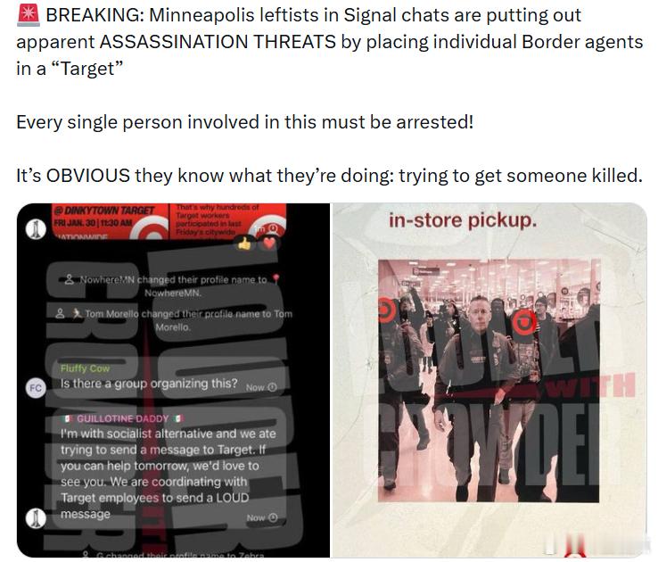 明尼阿波利斯的极左分子在Signal群聊中疑似发出“暗S威胁”,将个别边境执法人员列为“目标”。