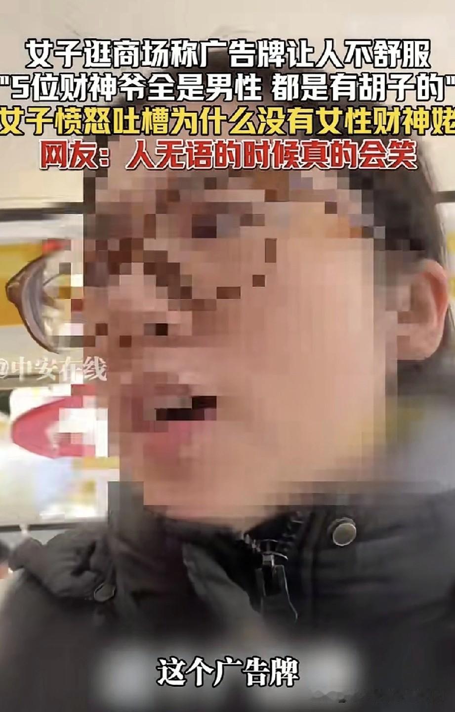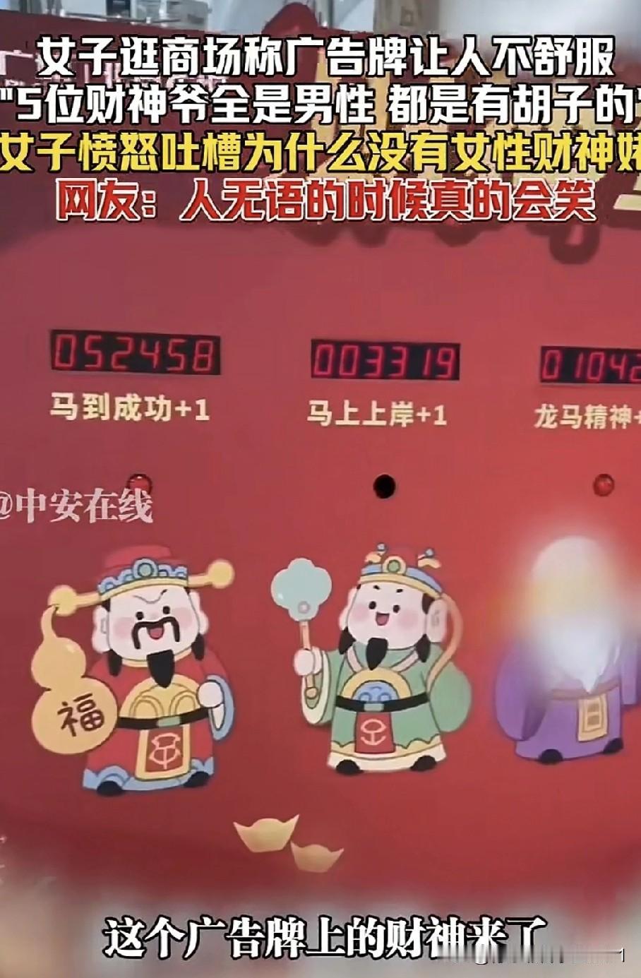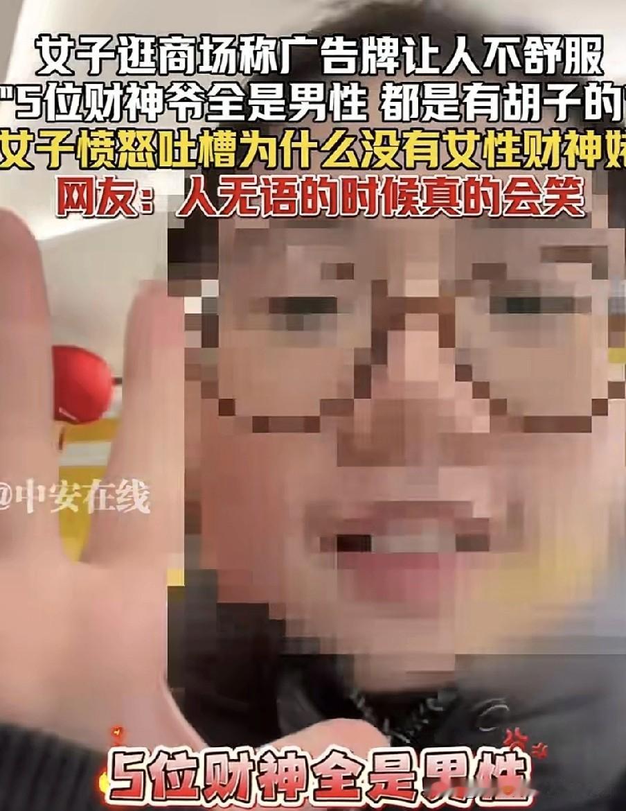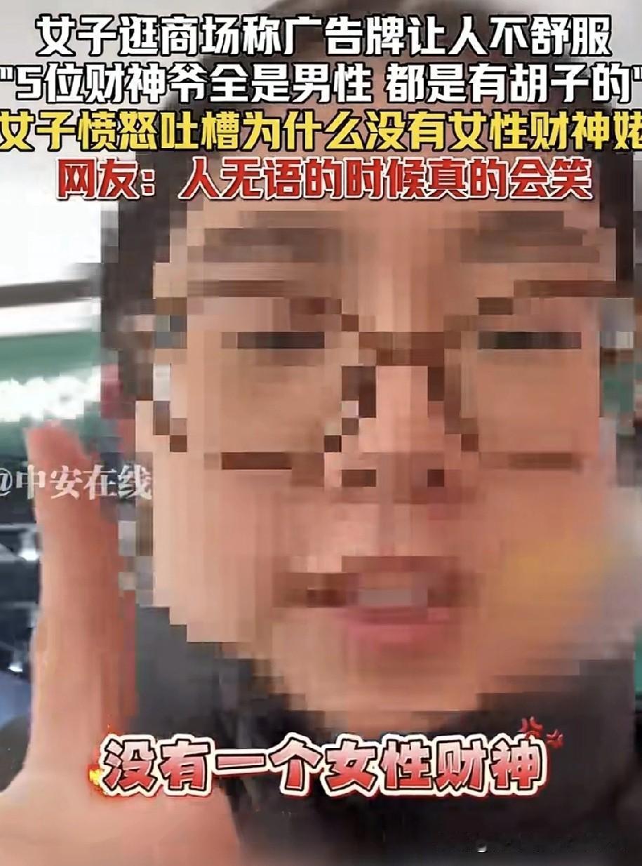 北京一女子逛商场时,在商场里看到一个广告牌,上面写着“财神来了”,是五位带胡子的财神。女子发视频表示,让她特别不适的点是,这五位财神全是男性,怎么就没有一位女财神呢?女子愤怒地呼喊:“我们的女财神佬呢?” 五路财神通常指东路财神比干、西路财神关羽、南路财神柴荣、北路财神赵公明、中路财神王亥,这是中国民间最为普遍的说法吧!。哪有女财神呀?