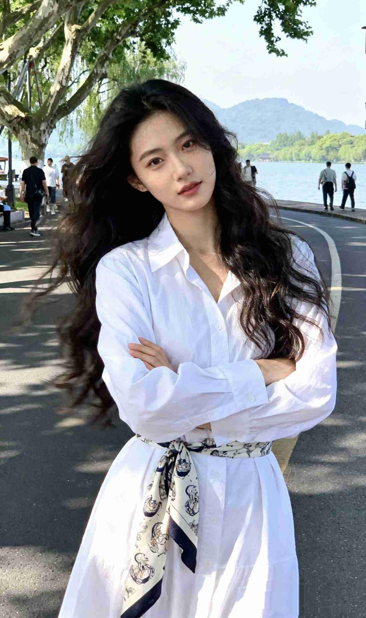 我的今日状态:😁轻松愉快 我这里的天气:☀️晴天 《湖岸晴光》 晴光铺岸柳风柔,白衫漫卷欲垂秋。 发随云影梳千缕,腰系丝巾绾一瓯。 臂抱清阴遮暑气,眸含远黛入汀洲。 人间好景西湖路,不待归帆始驻留。 赏析:这首诗以西湖畔的晴日漫步为核心,开篇“晴光铺岸柳风柔”直接呼应了图片里的湖面、晴日与梧桐树荫,用“铺”字让日光有了铺满湖岸的开阔感。“白衫漫卷欲垂秋”则将宽松的白衬衫比作流动的云,为夏日画面添了一丝清润的秋意。 “发随云影梳千缕,腰系丝巾绾一瓯”两句,精准捕捉了蓬松卷发与丝巾腰带的细节,用“梳千缕”形容发丝随微风轻扬的姿态,用“绾一瓯”让丝巾的图案有了可感的温润质感,把穿搭细节融入了诗意。 后半段“臂抱清阴遮暑气,眸含远黛入汀洲”,以“抱”与“含”两个动作,刻画了少女在晴日里慵懒又舒展的状态,将她的目光与远处的青山、汀洲相连,让画面有了延伸感。结尾“人间好景西湖路,不待归帆始驻留”,把眼前的片刻驻足升华为对西湖盛景的流连,让夏日的氛围感有了悠长的余韵。