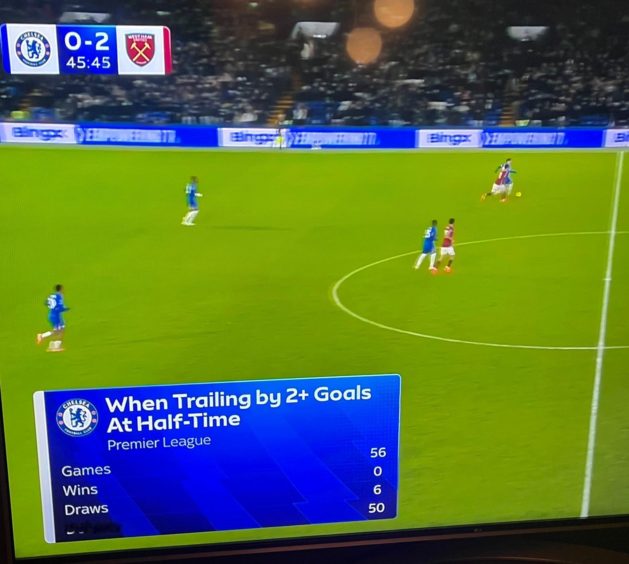 此前切尔西56次半场落后2球或以上,6平50负。这场终于3-2完成逆转。