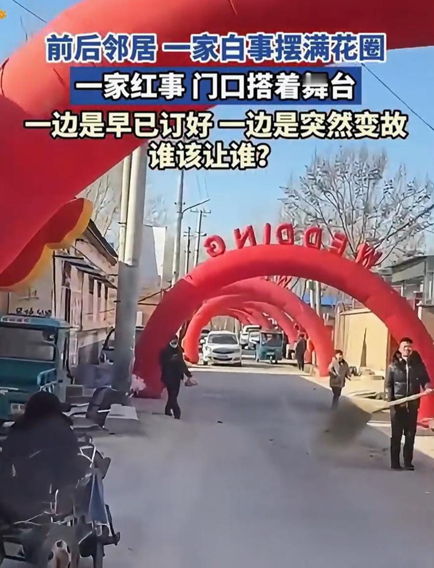 人类的悲欢并不相通!一村里前后邻居,同一天时间赶上两个大事,一家突然有人离世要办白事,另一家则是后辈结婚要办红事,谁让谁的问题也是让网友吵翻天 村民路过,拿手机拍了段视频。画面里,两家离得很近,门前却是两番光景。一边摆着花圈,静悄悄的,门帘低垂,偶尔有人进出也是低着头。另一边立着红色拱门,搭了台子,音响放着歌,有人唱着笑着,热闹得很 这视频传到网上,看的人多了,话也就多了起来 不少人开始争:这事该怎么处?都是大事,谁该让谁一步? 有人说,红事应该主动些,结婚的日子还能再挑,人走了却不能复生,该把安静留给逝者。也有人说,白事是不是也能体谅,人家结婚一辈子可能就这一回,敲锣打鼓也是习俗,总不能让人家冷冷清清办事 两边听起来都有理。但理是理,事是事 其实站在村里人的角度看,这事没那么非黑即白。白事讲究的是一个静,一个不被打扰。红事讲究的是一个喜,一个热热闹闹 两种事撞到一起,本身就不是谁对谁错,而是现实太巧合。很多网友代入的,其实不是规则,而是情绪。你要是那家刚失去亲人的,听到隔壁锣鼓喧天,心里肯定不好受。你要是那家办婚礼的,突然被要求全面停掉,也会觉得委屈 我觉得,如果双方都没办法改日期,倒不如各退一步。比如喜事这边把音量压低,把最吵的环节往后挪,表演能简就简。白事这边也明白对方不是故意添堵,给彼此留点余地。这种互相退一步的做法