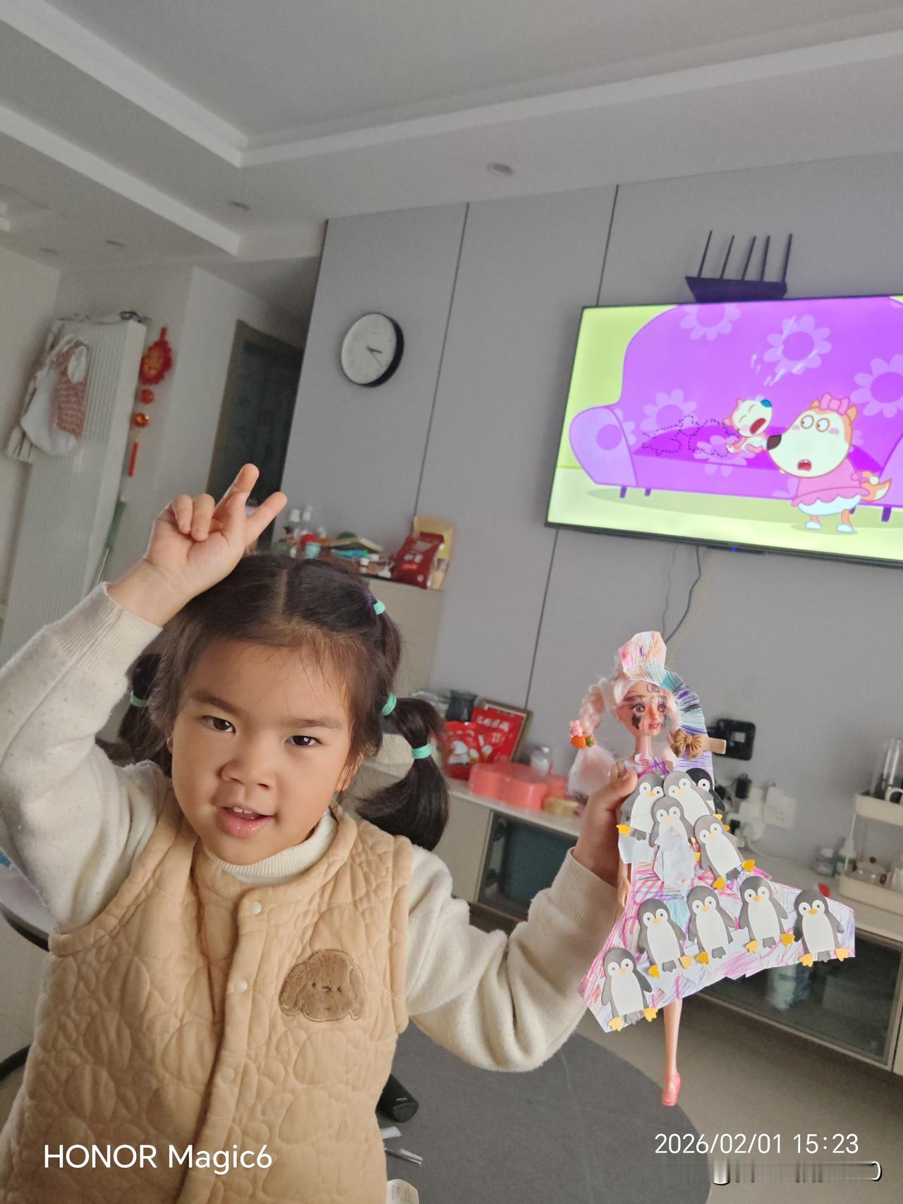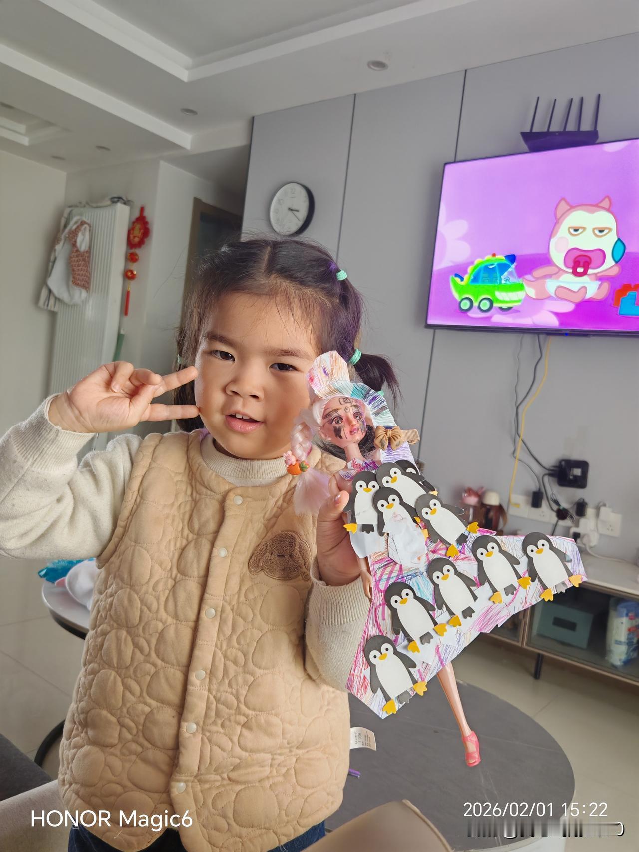 小朋友的手工作品太漂亮了。手工的温度,在指尖流淌。那串小企鹅挂饰,是孩子用彩纸与胶水编织的童话,每一只都像在诉说无声的故事。她举着作品,眼睛亮得像星星,仿佛整个世界都在她的掌心轻轻旋转。原来最动人的不是精致,而是那份专注与热爱,让平凡的材料有了心跳。