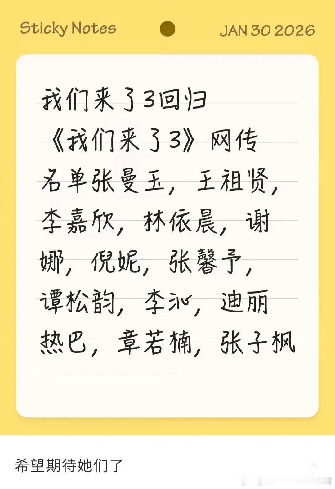 《我们来了3》网传名单张曼玉 王祖贤 李嘉欣 林依晨 谢娜 倪妮 张馨予 谭松韵 李沁 迪丽热巴 章若楠 张子枫