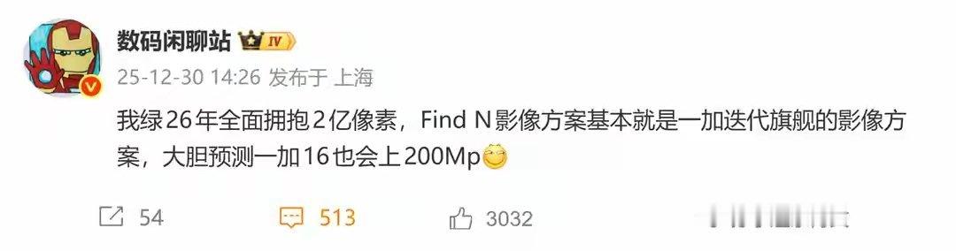 值得注意的是,博主 数码闲聊站 曾在去年末透露,绿厂 2026 年全面拥抱 2 亿像素,Find N 折叠屏手机影像方案就是一加迭代旗舰的影像方案,预测一加 16 也会上 2 亿像素 CMOS 传感器。