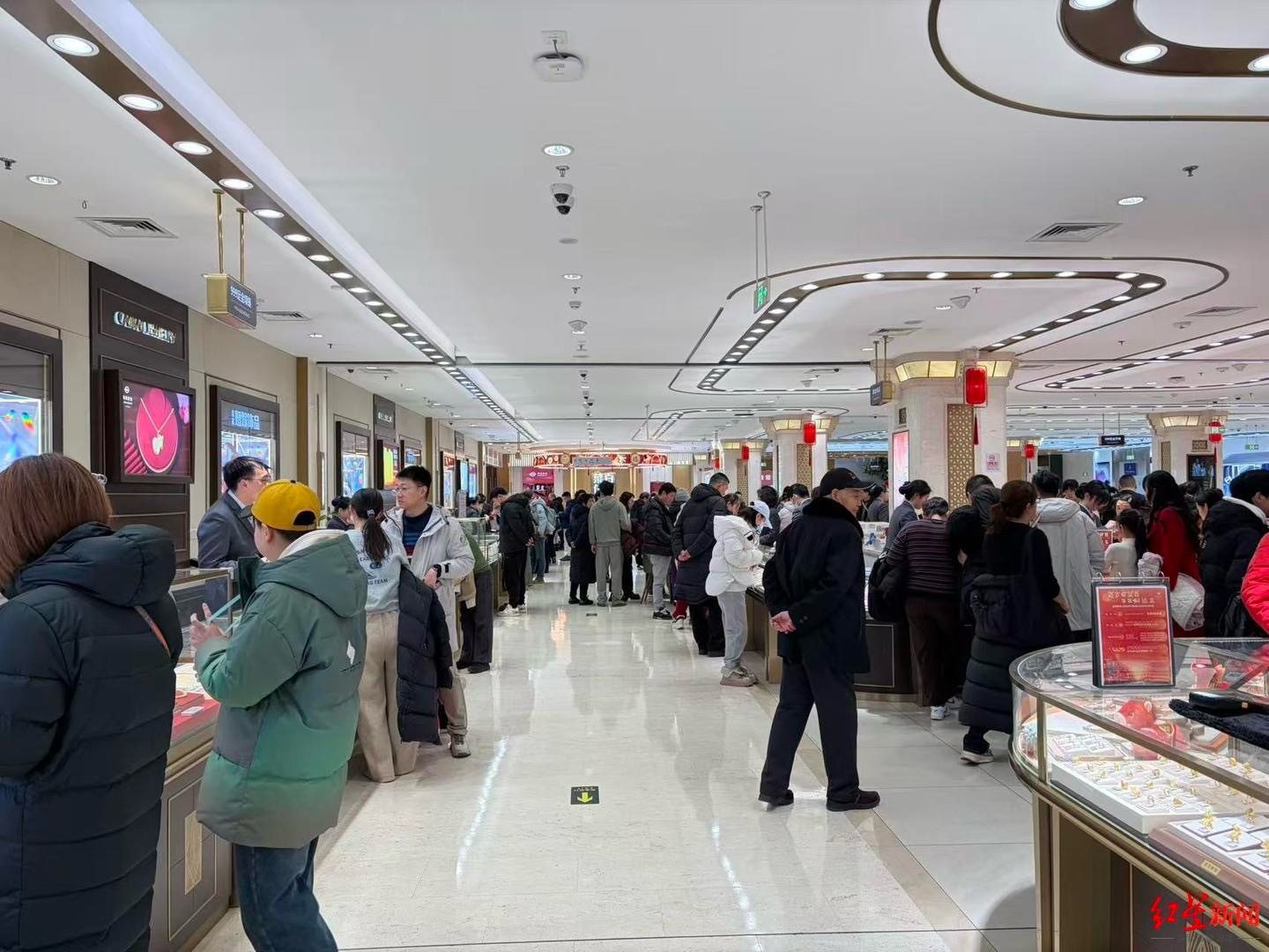 菜百首饰商场的一层主要是金饰品销售。2月1日中午,记者来到这里时,销售区域内挤满了看黄金和购买黄金饰品的人,有些人还拖着行李箱,而工作人员在柜台后不停忙碌。