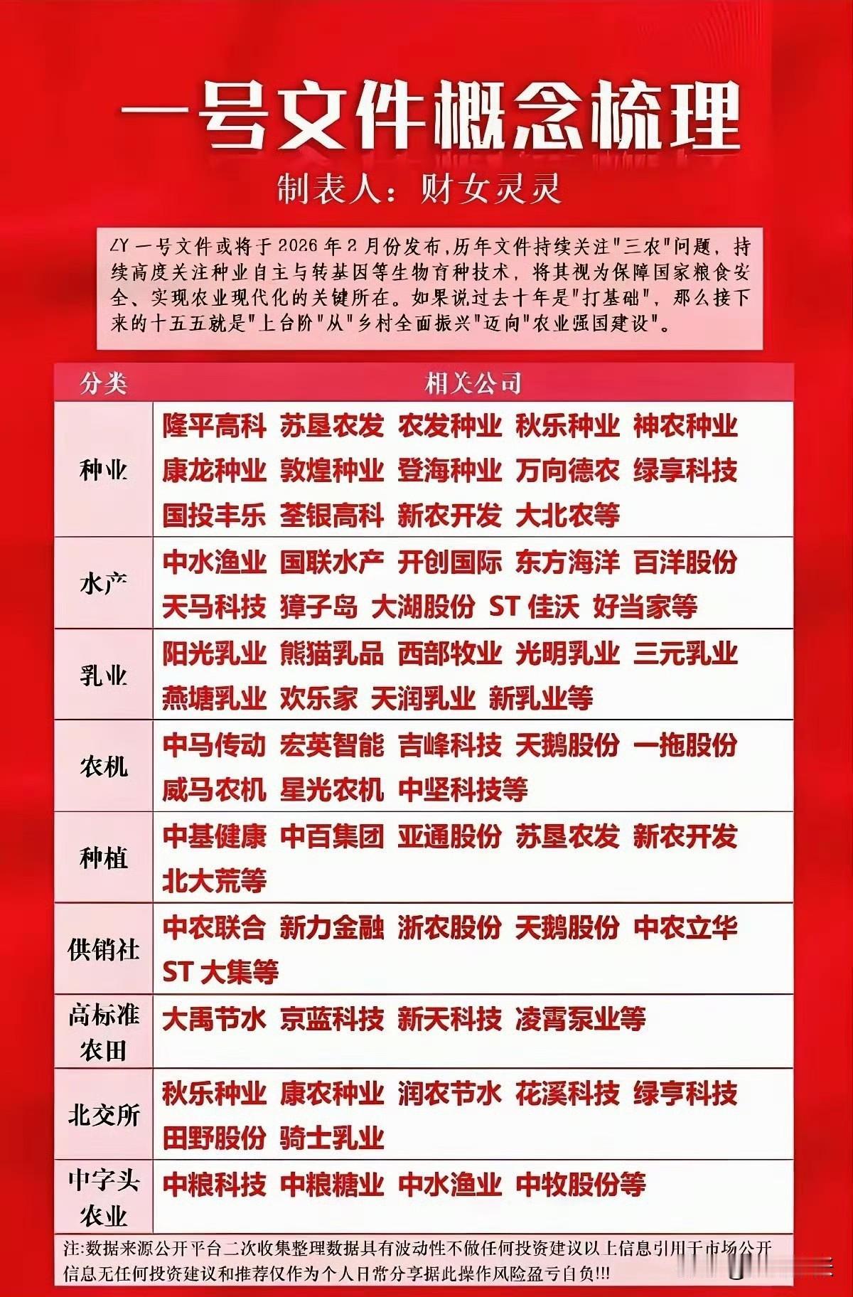 2026年中央一号文件蓄势待发,农业强国建设主线清晰浮现。这份梳理清单带你快速锁定种业、水产、农机、供销社等核心赛道的关联标的,从生物育种到高标准农田,从乡村振兴到农业现代化,提前布局政策红利,把握春耕行情中的投资机会。