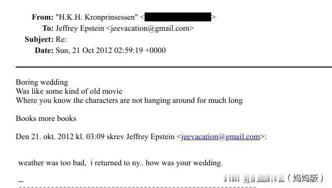 关于爱泼斯坦。这简直就是王室的终极王炸啊!挪威王储妃梅特在2012年通过电子邮件写信给爱泼斯坦,吐槽卢森堡王室 现任大公储夫妇的婚礼,无趣又令人生厌[呲牙]难怪当时梅特穿了一身黑!挪威国王夫妇估计被气得不轻!坐等后续!