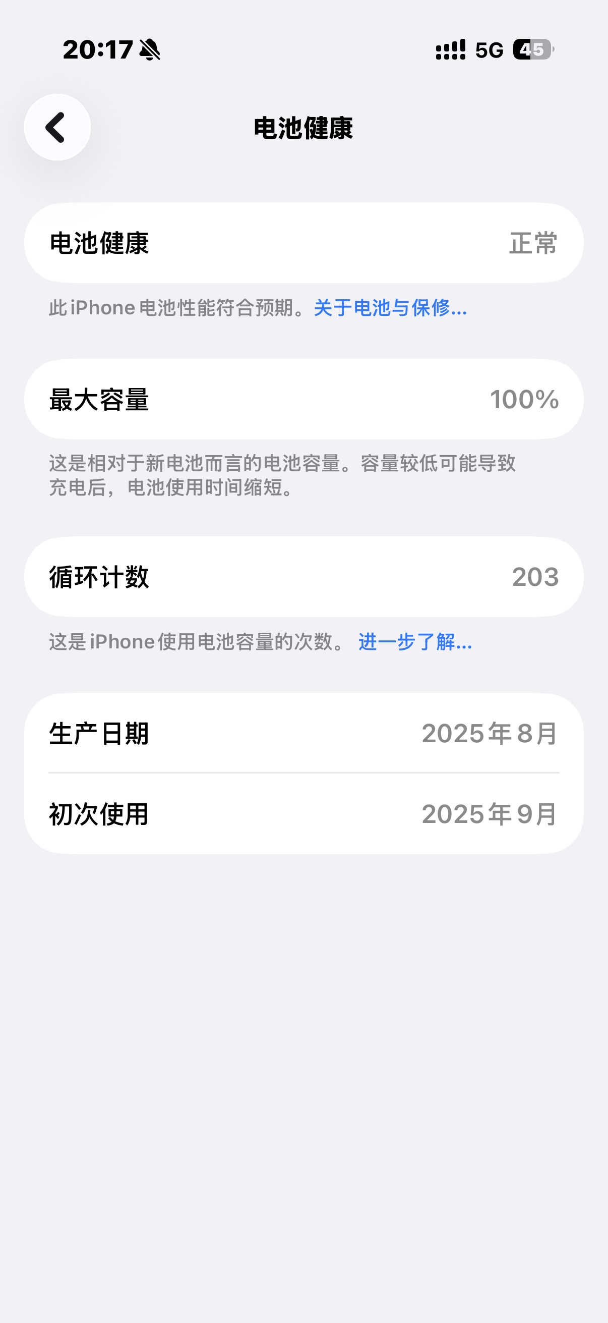 给大家参考一下,首发的17用到现在四个多月了,完整的充电循环两百多次,算下来日均充1.5次,现在还是百分百