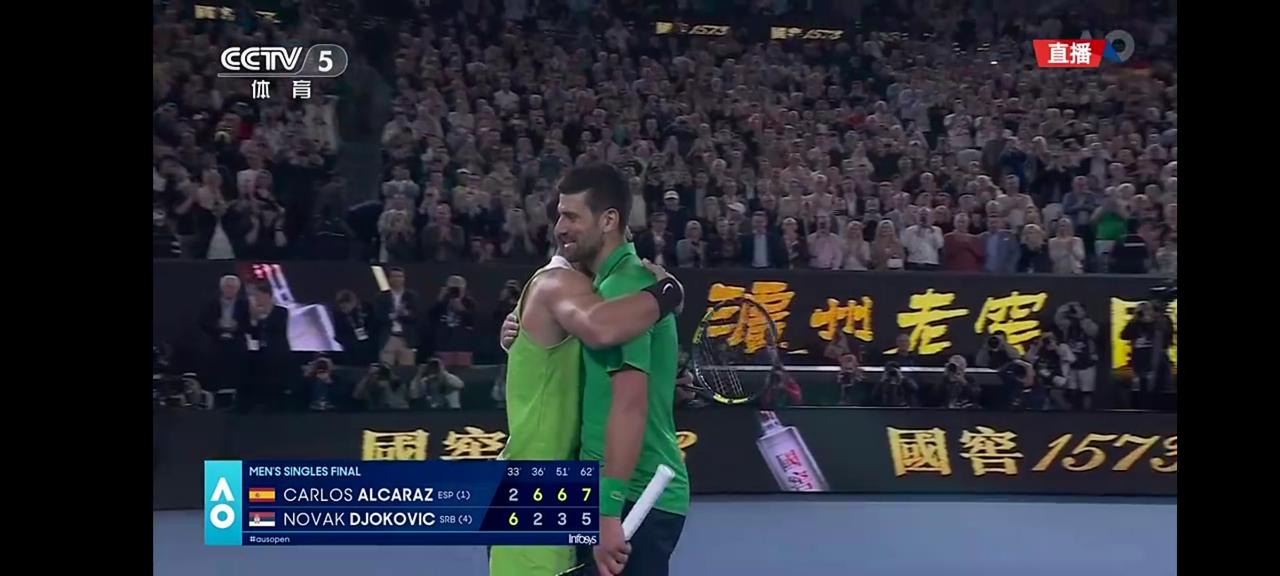 澳网巅峰对决,38岁的德约燃尽了,阿卡3:1胜德约首夺澳网夺第7冠,完成全满冠,坐稳世界第一宝座。 2026澳大利亚网球公开赛男单决赛,赛会头号种子年仅22岁的6冠王阿尔卡拉斯,挑战24个大满贯天神澳网10冠王4号种子德约科维奇。 第一盘,体能充沛的德约科维奇6:2拿下第一盘。 第二盘,阿尔卡拉斯6:2取胜,盘分1:1。 第三盘,38岁255天的德约科维奇到了体力瓶颈期3:6再丢1盘。德约科维奇还为长达16拍取胜的阿卡竖起了大姆指。 第四盘,第2局,双方极限拉扯,单局时长达到12分钟以上,极大消耗了德约科维奇。但是德约科维奇的顽强精神和成熟高超球技下,与年轻力壮的阿尔卡拉斯相持。并且追成4:4平。连场下的纳达尔也表示叹服。本盘再次打出25拍的多拍,德约再次输给体力不支。5:7失利错失可能人类永远无法达成的第25个大满贯冠军。 祝贺:阿尔卡拉斯获得澳网第一个男单冠军,职业生涯第7个大满贯,并完成最年轻(22岁287天)的全满贯。 感谢:德约科维奇只是输给了岁月,为球迷带难以忘怀的网坛神话。为这顶体育运动增光添彩,星光永耀。 最后一个问题:假如阿卡和德约年龄相同,谁会夺冠?