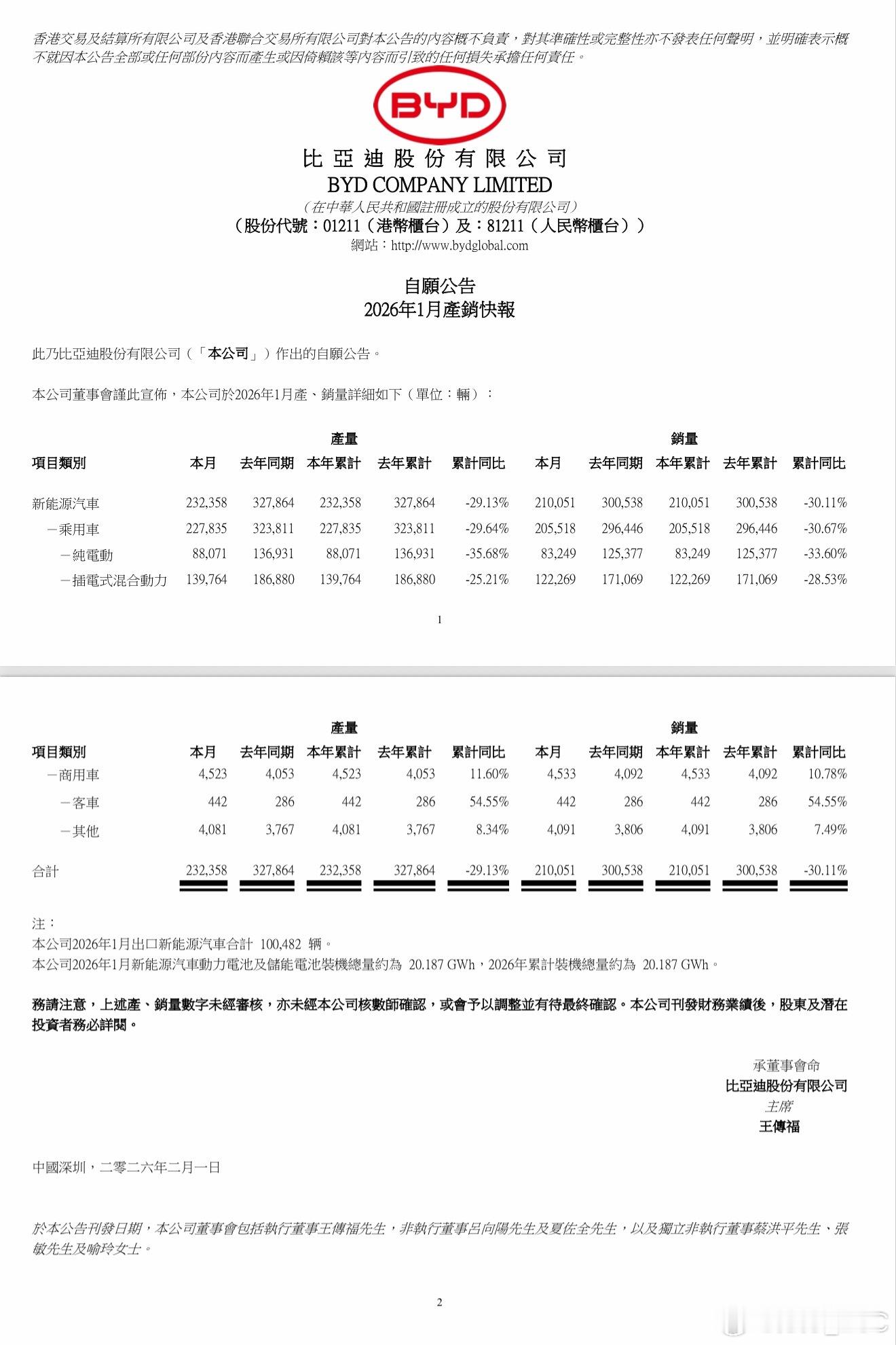 比亚迪全球1月销量21万台。