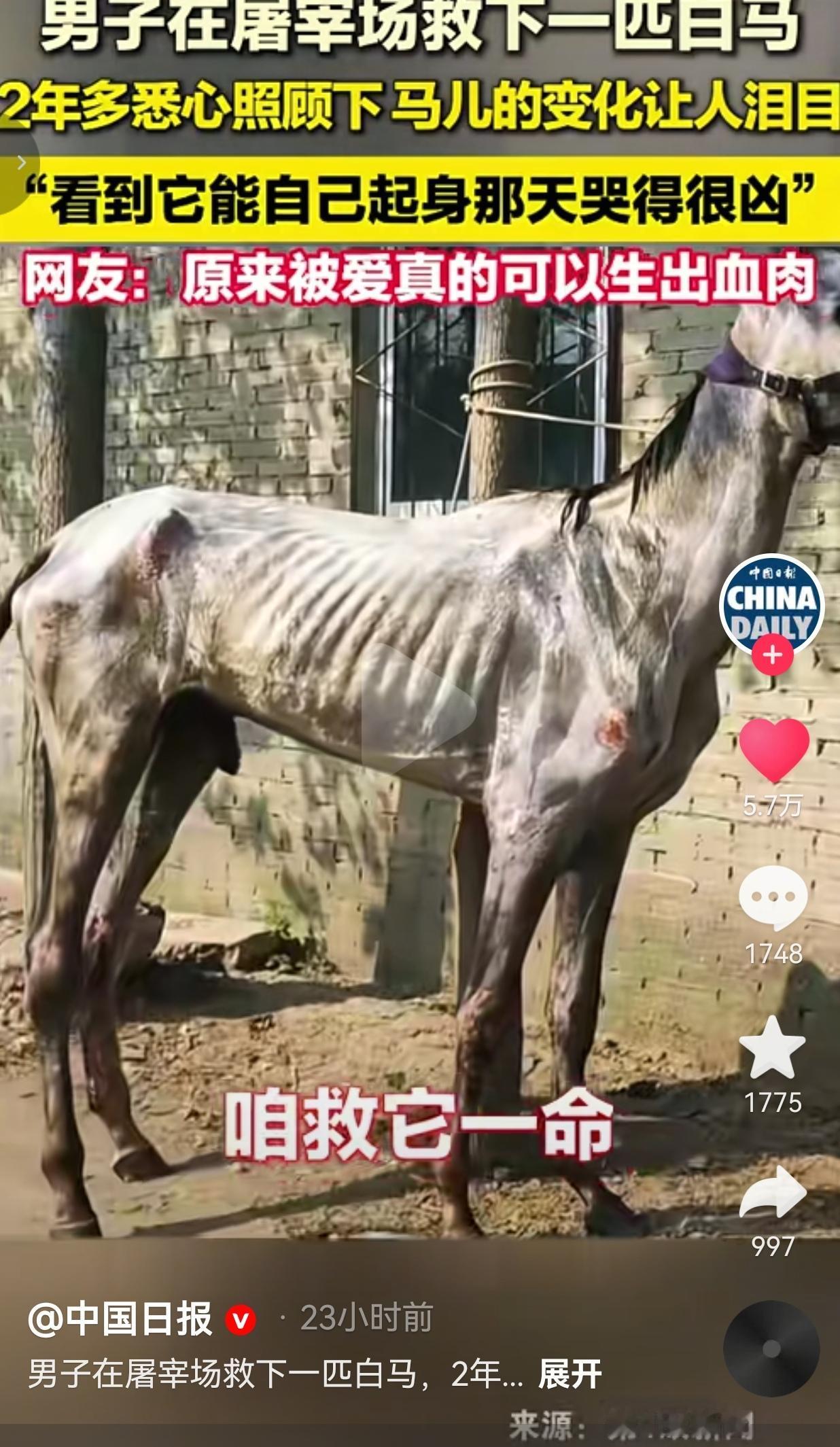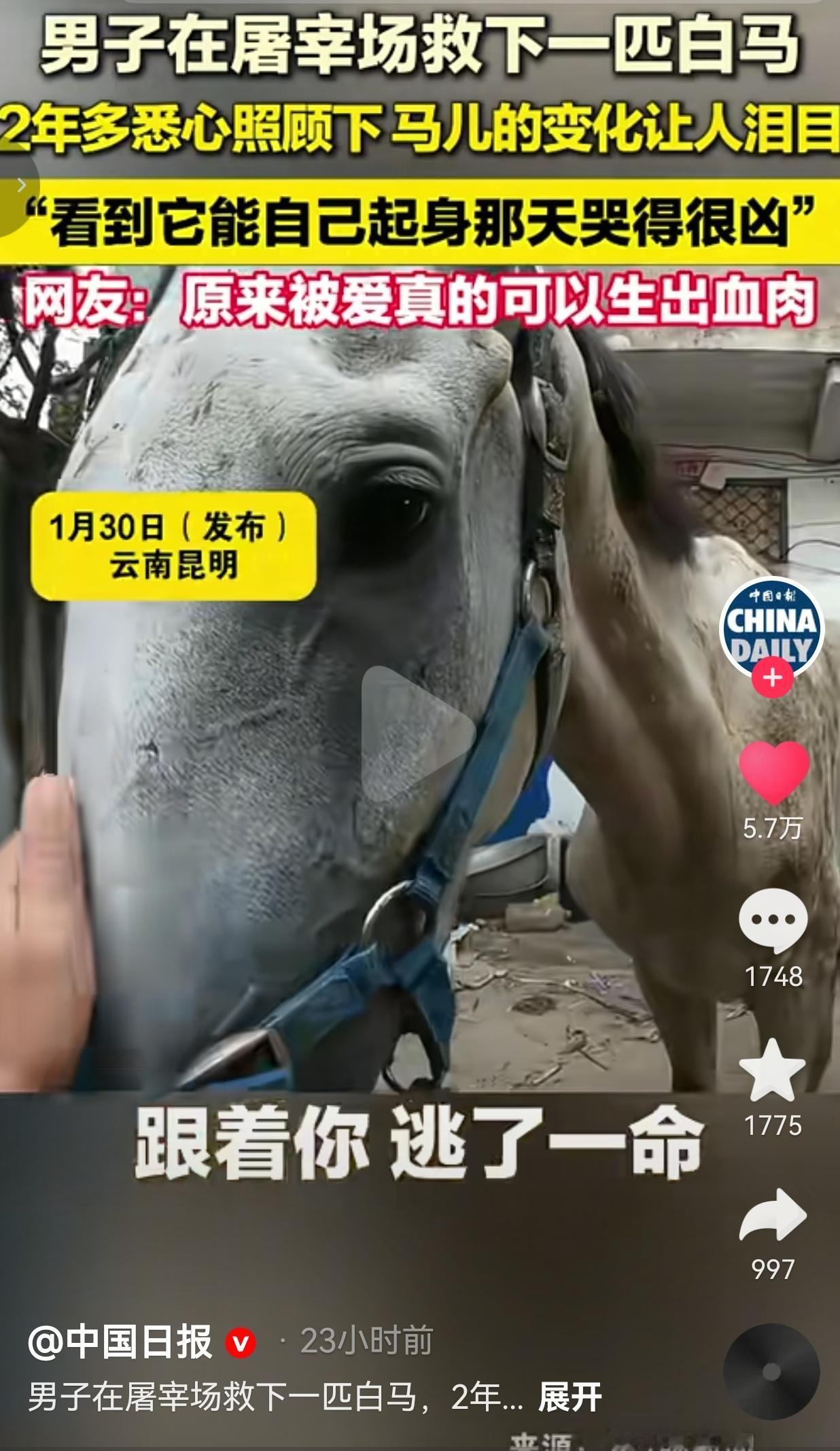 1月30日,云南昆明的丁大哥发了一段视频,视频中他称自己两年前在屠宰场看到一匹白马。 当时这匹马特别瘦,它瘦得只剩皮包骨头,肋骨根根分明,甚至连站都站不稳。而且,它的身上浑身都是擦伤,可是尽管如此,下一秒它就要被送上屠宰台。 丁大哥看到后,于心不忍,心里也很难过,他心想:“它都瘦成这样了,哪还有肉呀?为啥还要遭这个罪?” 于是,他思来想去,当场就掏出1万块钱,把这匹马就回了家,他还特意给这匹马取名为“石头”。 谁能想到,这一救,就是两年多的日夜相守,为了救它,甚至还背上了债务。 刚到家的“石头”,重伤加严重营养不良,连站起来的力气都没有。丁力不仅每天给它喂药、按摩、准备营养饲料,还四处借钱给它治病,一天就要花五六千,这样的日子持续了三四个月。 他夜以继日守在马厩里,就怕它熬不过去。终于有一天,“石头”挣扎着自己站了起来, 丁大哥说:“马站起来的那一天,他哭得像个孩子,根本控制不住。” 他还说:“跟动物相处的情感,非常非常的纯洁。” 如今,他负债养了两匹马,但是,他却笑着说:“钱没有了可以再挣,但生命只有一次。” 网友看到后评论说:“原来爱真的可以生出血肉!” 还有的网友说:“大哥心善,即使自己没有钱,也毫不犹豫救下马,给马治病,好人肯定有好报的。” 我们总说“万物有灵”,其实动物比人更懂得感恩。你给它一分暖,它就用一辈子来回报。 丁大哥什么也没说,他就是不忍心一条生命在眼前消失。这份善良,让这匹可怜的马重新活了下来,也让我们看到了平凡人身上最耀眼的光。 生活里,我们总在计较付出和回报,可在“石头”和丁力的故事里,答案变得特别简单:爱从来都不是交换,而是我愿意为你拼尽全力,只因为你值得。