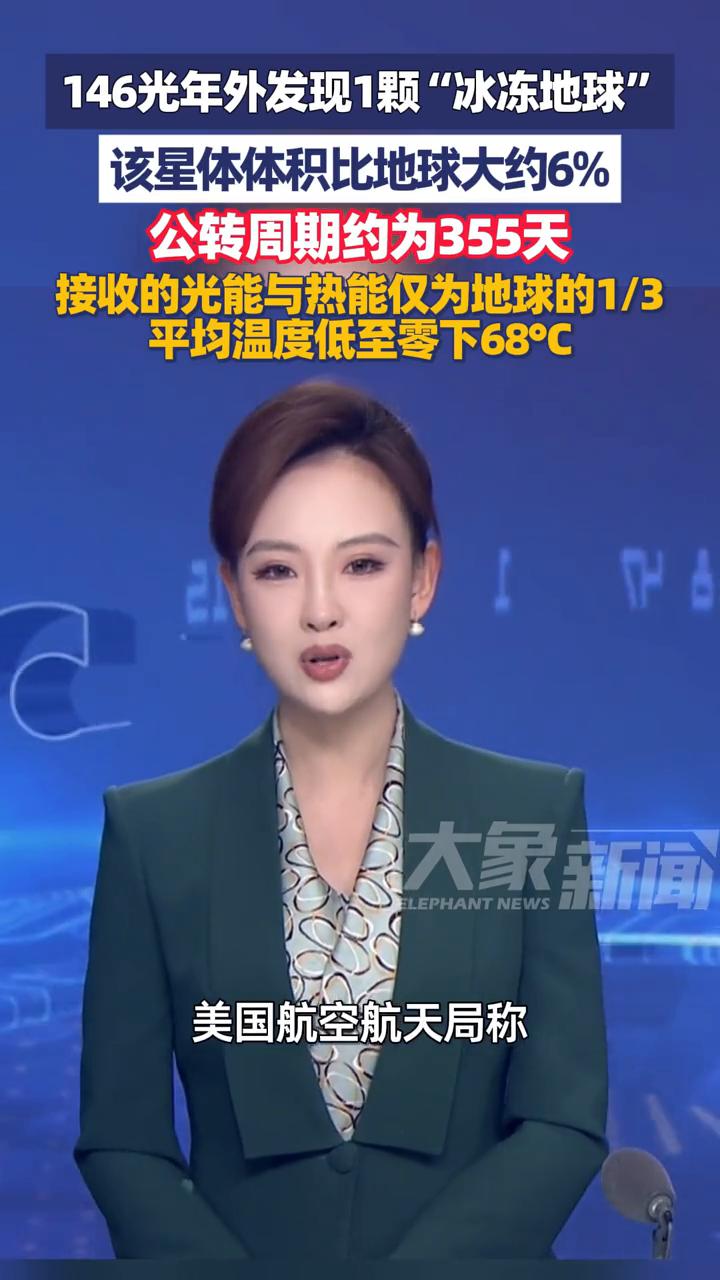 146光年外发现1颗"冰冻地球",公转周期约为355天。 大象新闻主播刘琳。 据环球网报道,近日天文学家发现一颗体积大小、公转规律与地球高度相似的"冰冻版地球"。报道称该星体体积比地球大约6%,围绕着一颗类似太阳的恒星公转,公转周期约为355天。根据测算,这颗星体有50%概率处在其所属星系的"宜居地带"。 美国航空航天局称,其地表接收到的光能与热能仅为地球的3分之1,这是由于它所环绕的恒星比太阳"冷淡"的原因。因此,该星球的地表环境可能与火星类似,平均温度低至零下68°C。