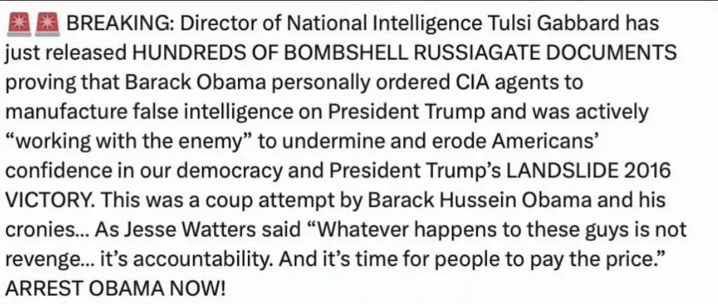 美国总统老特公开呼吁逮捕前总统贝拉克·侯赛因·奥巴马,指控其存在组织政变的企图。导火索是美国国家情报总监塔西·加巴德公布的“通俄门”相关文件。老特声称,数百份文件证明奥巴马曾亲自下令伪造关于“俄罗斯干预”2016年大选的情报。 老特强调,他呼吁逮捕奥巴马,不是打击报复,而是追究奥巴马滥用职权的责任。 老特不强调还好,强调之后谁都知道他是在对奥巴马打击报复。以老特的小心眼儿,他对民主党的希拉里、奥巴马、佩洛西、拜登都是恶感满满,急于除之。