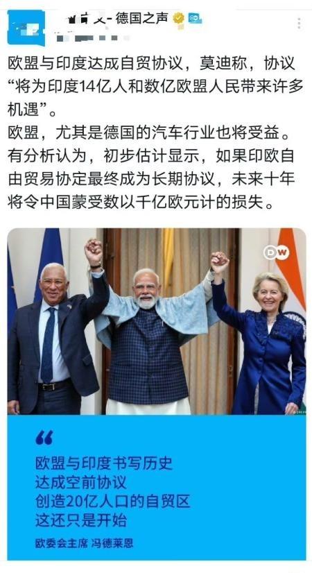 欧盟与印度达成自贸协议,德媒称,未来十年将让中国损失数千亿欧元。然而仔细看这份协