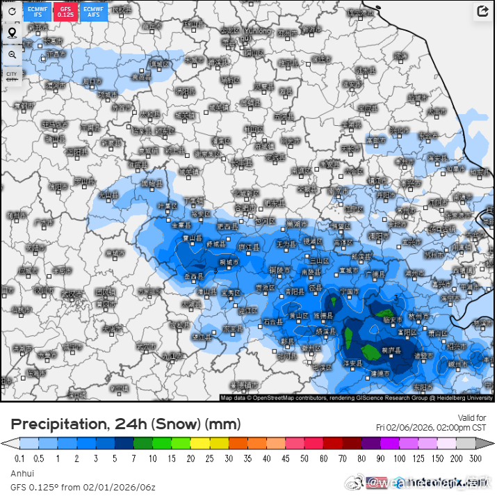 【雨雪】昨晚到今天我国降水较少。2026年春运,明天开启,未来3天,我国依然是晴天多、雨雪少。不过2月5-6日南方又有一轮大范围降水过程。这次降水,在5日晚-6日白天,安徽江苏一带的降水,变数很大。欧洲数值给了大范围强降雪(图7),欧洲AI模式只在大别山区报了小范围降雪(图8),美国数值预报的雪主要在皖南和浙北山区。