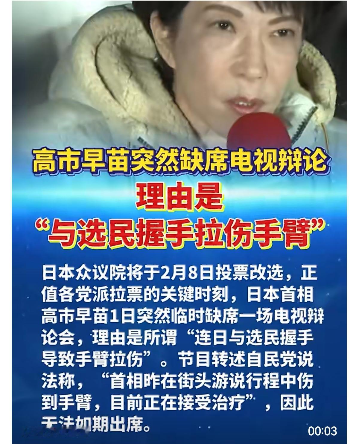 日本众议院将于2月8日投票改选,正值各党派拉票的关键时刻,日本首相高市早苗1日突然临时缺席一场电视辩论会,理由是她连日与选民握手导致“手臂拉伤”。 据日本经济新闻2月1日报道,高市早苗原定于今早出席日本广播协会(NHK)播出的一档政论节目,节目安排日本各党派领导人以现场连线方式进行选前辩论,但节目一开始主持人便表明,“高市首相今天无法出席,是今早才接获通知。” 节目转述自民党说法称,“首相昨在街头游说行程中伤到手臂,目前正在接受治疗”,因此无法如期出席。自民党方面改由代理政调会长田村宪久代为出席。 报道称,高市早苗的缺席引发在野党质疑。日本在野党令和新选组代表大石晃子在节目中称,她原本想在今天的节目中直接向高市首相本人确认,是否曾接受“世界和平统一家庭联合会”(前“统一教”)的政治募款。
