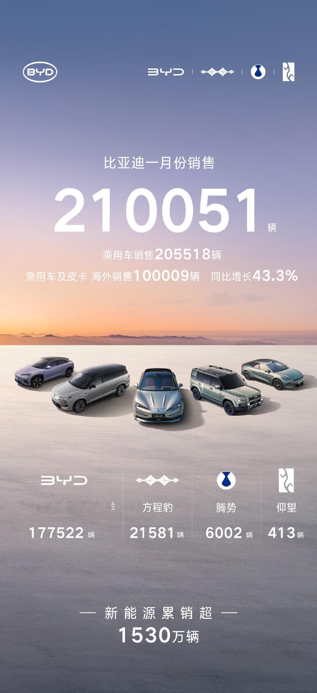 比亚迪2026年1月销量205518辆。