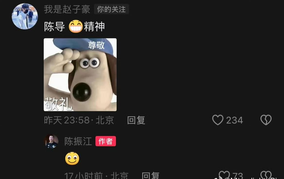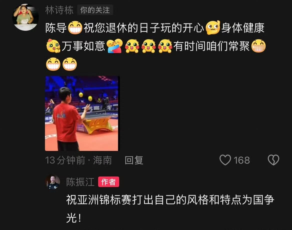 陈振江指导今天开抖音了, 把带过的队员如曼昱、赵子豪、向鹏等通通艾特了一遍[捂脸],第一个艾特的是林诗栋[赞]。 今天下午林诗栋给陈振江指导评论留言了,几串串开心笑脸点缀下,他给师傅留言说祝陈导退休的日子里玩的开心、身体健康等等。 陈振江指导也立马回复: 祝亚洲杯打出特色为国争光。 陈振江曾评价林诗栋是一个快乐的人,训练刻苦。感觉他是真欣赏林诗栋的。