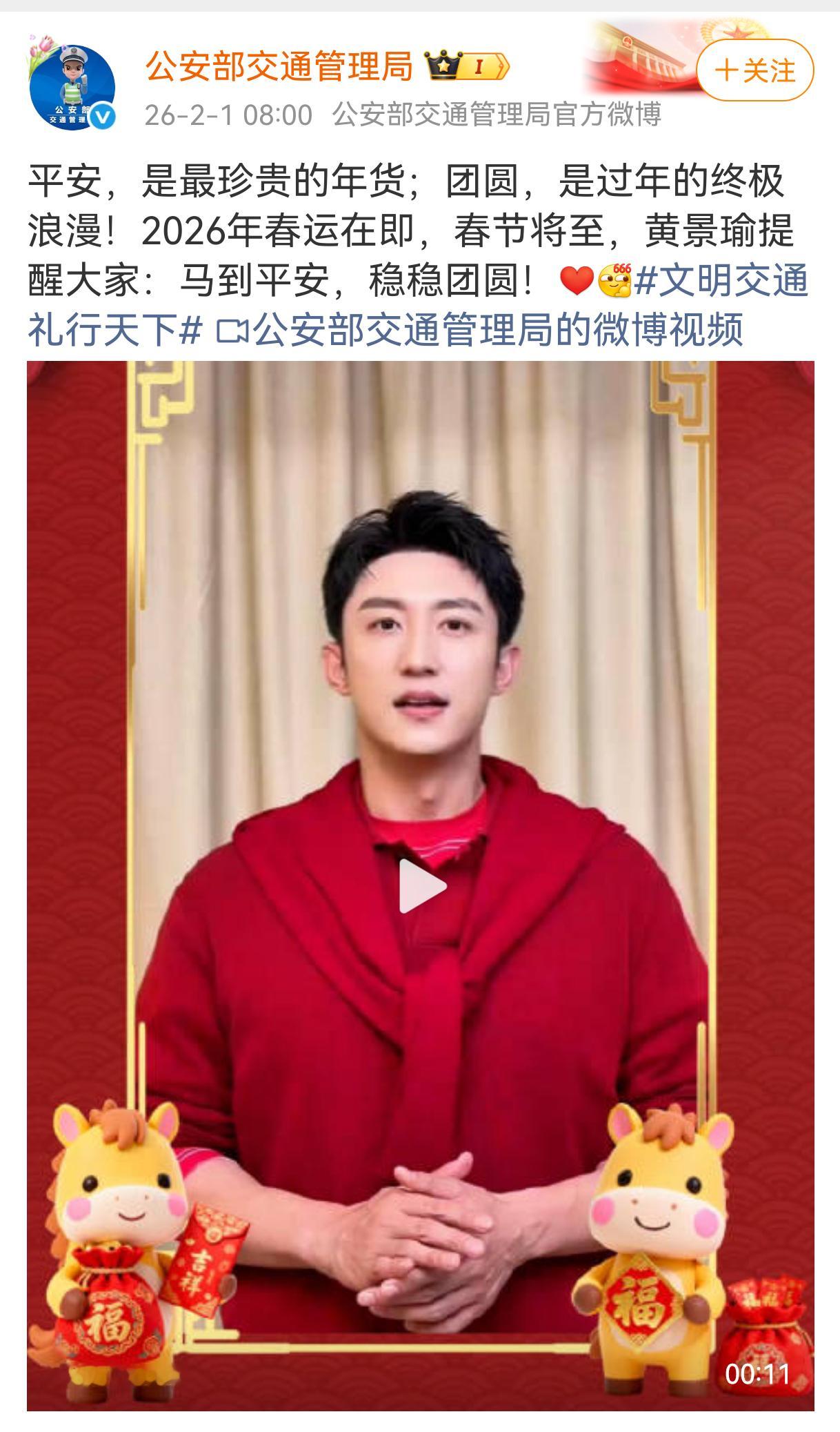 二月的第一天,公安部交通管理局(就是管全国交警的)发了黄景瑜的马年新春祝福口播,提醒大家文明出行,马年平安(翻了一下近半年貌似就这一个艺人出镜口播)黄Sir真的仿佛是警界抽调到内娱拍戏的
