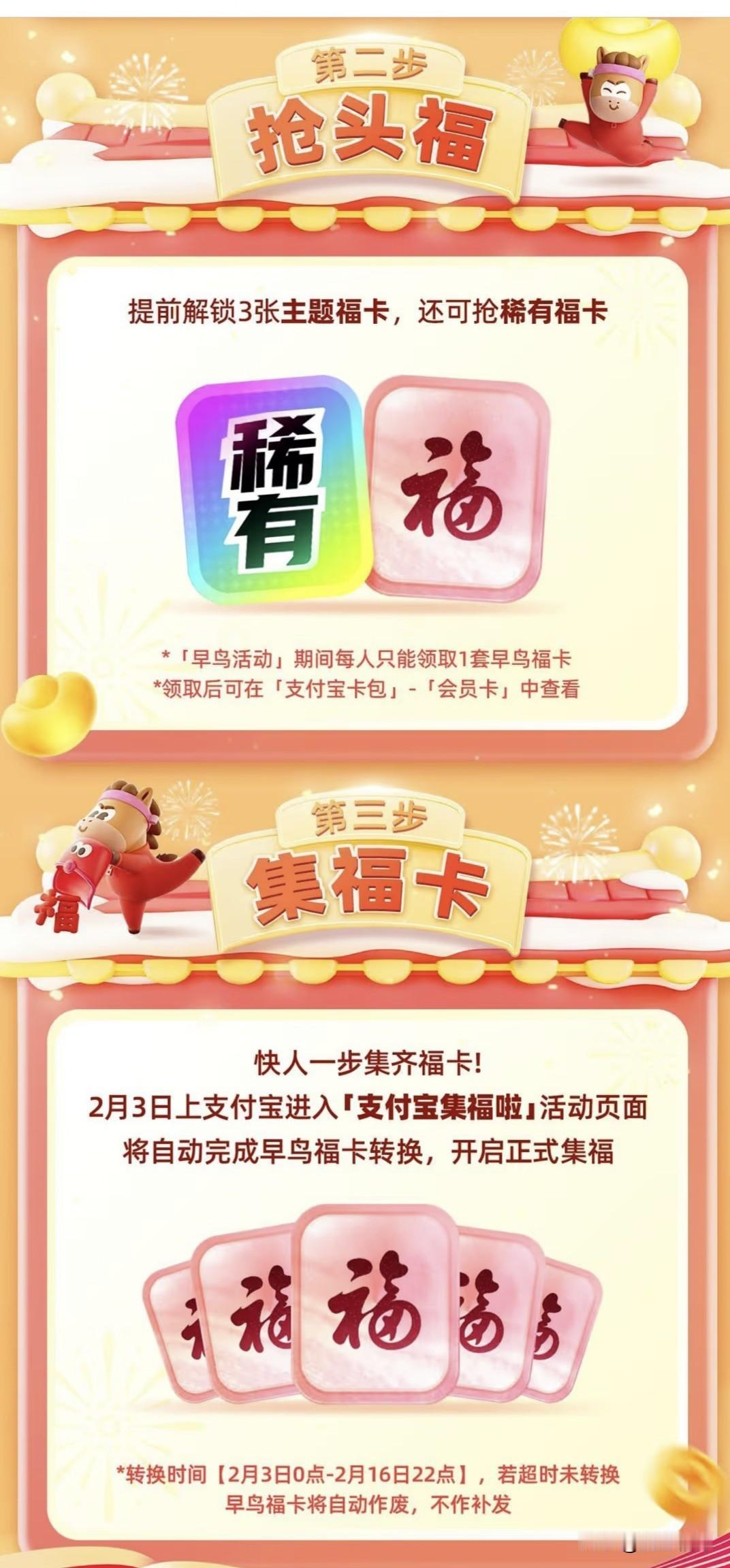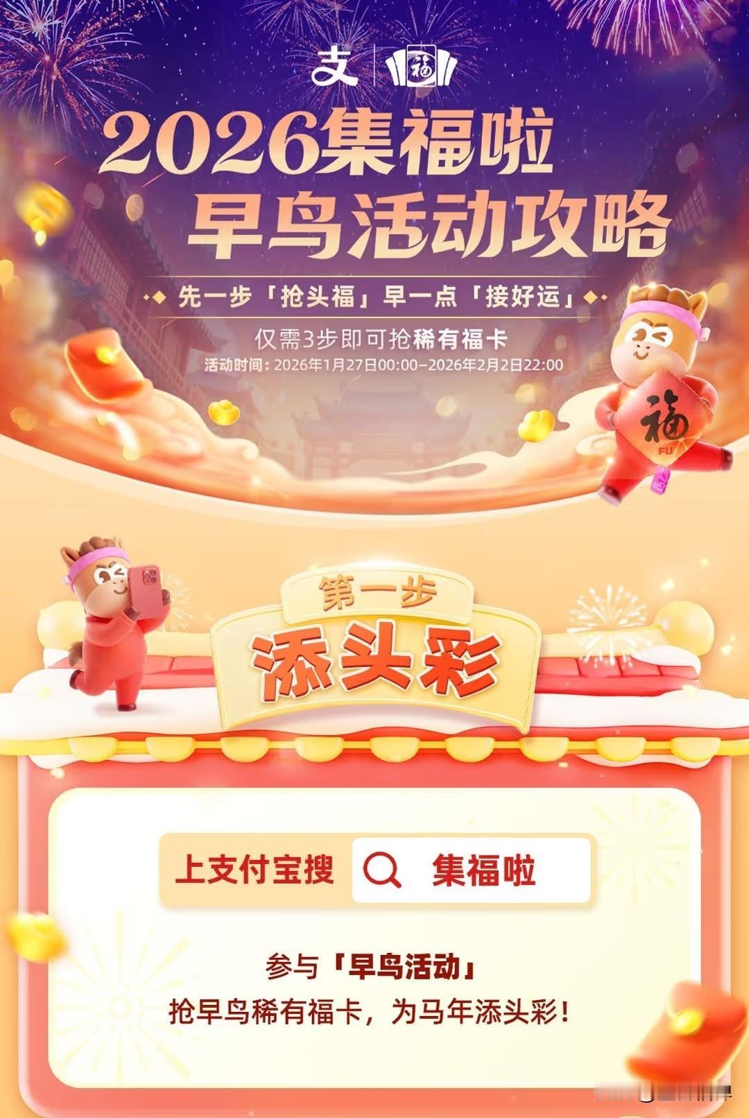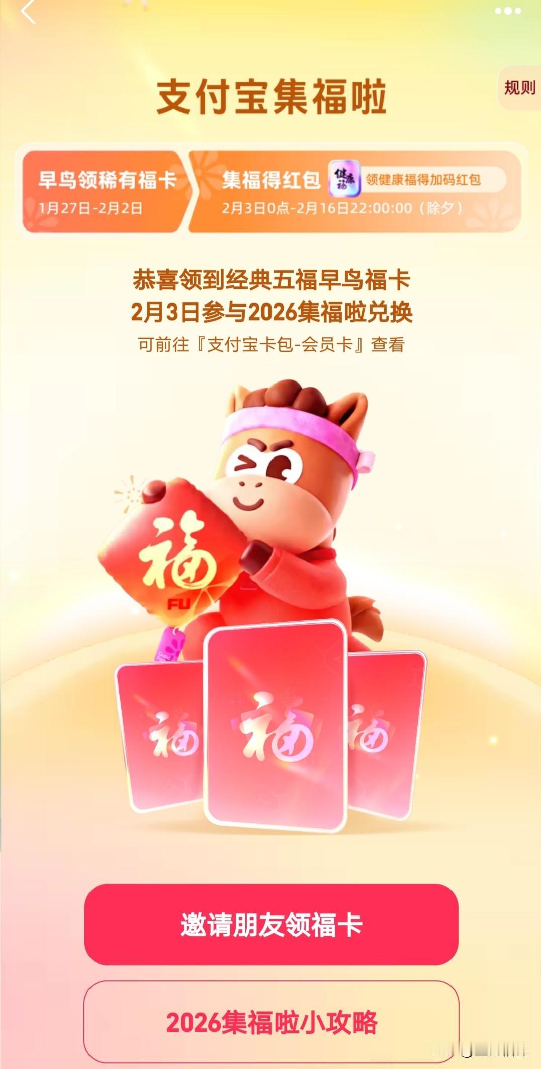 2026年支付宝集福活动竟然已经偷偷开始了,早鸟福卡速领,晚了就没了。 支付宝2026集福1月27日就已经悄悄上线早鸟活动,可提前解锁主题福卡,还可以抢早鸟稀有卡,除夕直接兑红包。 活动时间:1月27日-2月2日,参与方式:打开支付宝搜“集福啦”,直接领经典五福早鸟福卡,2月3日可直接参与兑换。 早鸟活动期间每人只能领取1套早鸟福卡,领取后可在[支付宝卡包]-[会员卡]中查看。 集卡领福袋 支付宝集红包 支付宝抽福卡 五福临门集卡 支付宝集卡 新春集卡 支付宝五福袋
