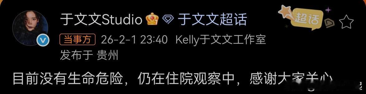 2月1日于文文在贵州商演时疑似晕倒被救护车拉走。从现场观众发的视频能看到,她演唱时就明显不舒服,后背对观众蹲下后就晕倒了。 她近日工作相当密集,刚结束深圳演唱会,马不停蹄就到贵州演出。工作室公布的2月行程里,后面还有广告拍摄、颁奖盛典、综艺录制等。好在工作室发文报平安,说目前没生命危险,还在住院观察。 于文文之前凭借《前任3》插曲《体面》火遍大江南北,希望她能好好休养,别再这么拼命工作啦。 于文文女性力量 于文文晕倒