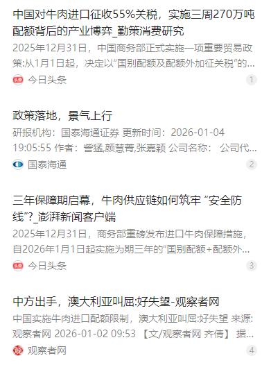 美国着急,中国出手了!这一下,可是打到了关键地方。我们国家决定,对从巴西、澳大利亚、美国这些地方进口的牛肉,实行配额管理。什么意思呢?就是规定一个进口的数量,超过了这个数量,再加征高额的关税。 麻烦看官老爷们右上角点击一下“关注”,既方便您进行讨论和分享,又能给您带来不一样的参与感,感谢您的支持!   2025 年 12 月 31 日中国商务部正式官宣,从 2026 年 1 月 1 日起对进口牛肉实施三年期的国别配额管理,巴西、澳大利亚、美国等主要供应国都被纳入管控范围,超出配额的牛肉要加征 55% 的高额关税,这记调控重拳直接打在了国内牛肉市场的痛点上。   所谓配额管理,就是给每个牛肉出口国划定明确的进口数量红线,2026 年全国牛肉进口总配额定在 268.8 万吨,比 2024 年实际进口的 287 万吨有所缩减,各国份额按实际贸易情况分配,巴西 110.6 万吨居首,美国仅 16.4 万吨位列末位。   这几年国内牛肉进口量一路猛涨,2019 到 2024 年从 166 万吨飙升至 287 万吨,涨幅超 73%,巴西、澳大利亚、美国的牛肉占了国内进口市场的大半份额,这些低价进口冻牛肉持续冲击着本土市场。   进口牛肉价格优势明显,2024 年 9 月国产鲜牛肉和进口冻牛肉的价差达到 12.26 元 / 公斤,同比涨了 72.61%,本土牛肉根本拼不过。低价进口货直接压低了国内牛肉的整体售价,让养牛户陷入了成本高、售价低的困境。   国内养牛的各项成本逐年走高,公牛犊购入成本到了 18 元 / 斤,出栏价却只有 14 元 / 斤,再加上饲料、地租涨价,不少养牛场近三年只能勉强维持,只求少亏一点。持续的亏损让不少养牛户心灰意冷,无奈退出了这个行业。   更让人揪心的是,亏损迫使养殖户低价出售甚至屠宰能繁母牛,这直接导致肉牛产业的产能根基受损。要知道肉牛产业的产能恢复至少需要三到五年,长此以往,国内养牛行业的发展会陷入恶性循环。   2023 年以来国产牛肉价格累计降了 22%,肉牛价格跌幅更是高达 28%,跌到了 2013 年以来的最低水平。整个国内养牛行业都陷入了发展困境,急需政策出手帮扶,给本土产业争取喘息和恢复的空间。   商务部出台的这份配额管理政策,正是精准的市场调控手段,既不是完全限制进口,也不是放任低价牛肉涌入。政策牢牢把控着进口总量,既保障了国内市场对进口牛肉的基本需求,又能有效抑制其过度涌入。   配额管理直接减少了本土养牛业的外部竞争压力,从根源上遏制国内牛肉价格暴跌的趋势。随着低价进口牛肉的流入量得到控制,国内牛肉的价格体系会逐步回归合理,养牛户的收益也能慢慢得到改善。   有了政策托底,养牛户的生产信心能得到提振,原本退出行业的从业者可能重新回归,还能吸引新的资金和力量投入养牛产业。这会推动国内养牛业逐步恢复活力,慢慢改善当前的生产经营环境。   政策出台后,业内也有不少人担心,配额外加征高额关税会让进口牛肉的成本上升,最终推高市场售价,给消费者带来价格压力。这种担忧其实也在政府的考量范围内,制定政策时早已充分评估了价格影响。   从实际市场反应来看,政策落地后只有高端进口牛肉小幅涨价,国内牛肉零售市场整体保持稳定。餐饮等 B 端虽有部分品类成本上涨,但因市场竞争激烈,很难把成本压力完全转嫁给 C 端消费者。   而且政策给国内养牛业留出了三年的发展窗口期,随着本土养牛业的产能逐步恢复,国产牛肉的供给量会稳步提升。届时消费者不仅能买到价格合理的本土牛肉,还能选择高品质的国产热鲜肉、冷鲜肉。   此次牛肉进口配额管理政策,是中国保护本土养牛业、推动农业现代化的重要战略布局。政策的实施完全符合国际贸易规则,既没有违背国际贸易的基本准则,也兼顾了贸易伙伴的合理诉求。   虽然巴西、澳大利亚等国的牛肉出口会受到一定影响,澳大利亚甚至预估会损失约 10 亿澳元的出口收入,但中国并未针对单一国家,而是对所有主要供应国统一实施配额管理,避免了引发与主要出口国的重大贸易冲突。   巴西对华牛肉出口虽被限定在 110.6 万吨,但其政府表示无需恐慌,可通过谈判协商补偿措施,还能将牛肉出口转向其他国际市场。美国虽获得最低配额,但近年其对华牛肉出口本就呈大幅萎缩态势,政策影响相对有限。   中国在此次牛肉贸易调控中,既坚定保障了国内农业产业的核心利益,又展现出了灵活的贸易谈判和市场调控智慧。这种基于本国产业实际、符合国际规则的调控方式,也为其他国家处理农业贸易问题提供了有益参考。   未来三年,随着政策的逐步落地,国内养牛业会迎来转型发展的黄金期,产业链的短板会逐步补齐,产业竞争力会持续提升。而全球牛肉贸易格局也会因中国的这一举措发生微妙调整,向着更均衡的方向发展。