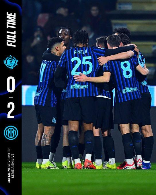 国米客场2-0克雷莫纳,各项赛事三连胜,先赛一场以55分、8分优势领跑意甲;克雷莫纳积19分排第15,深陷保级区。