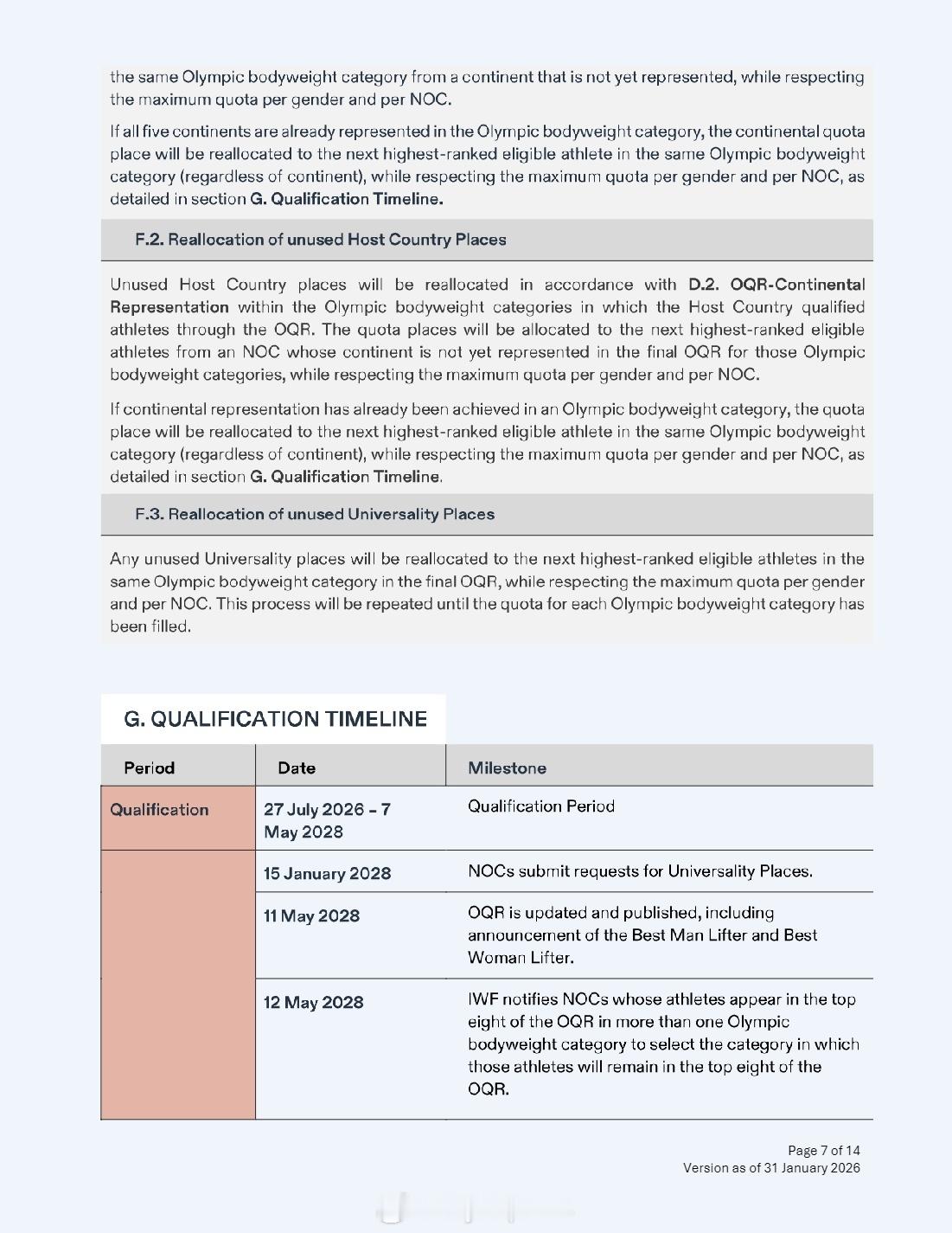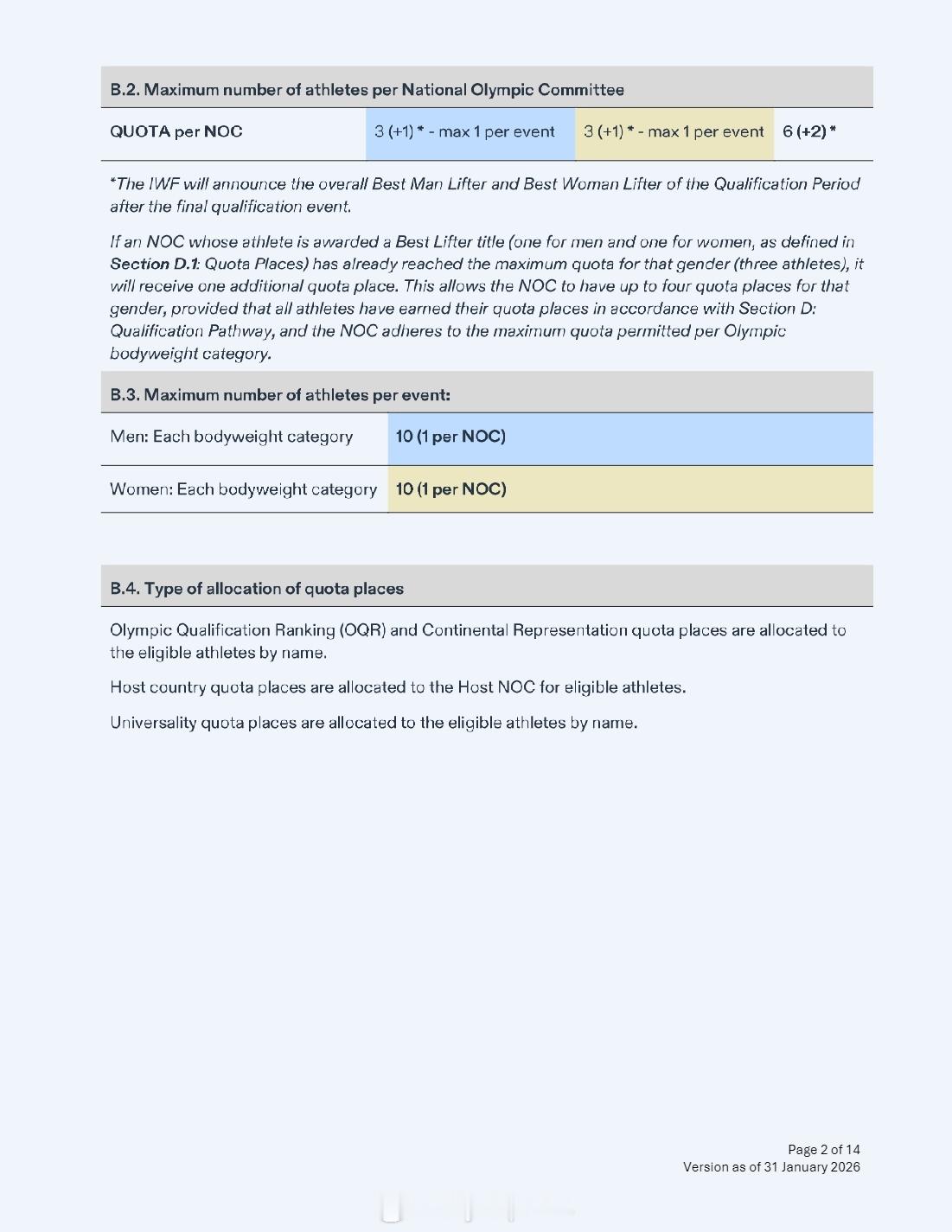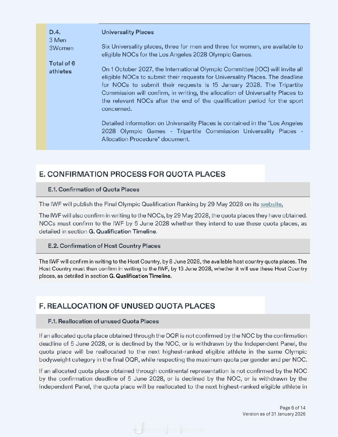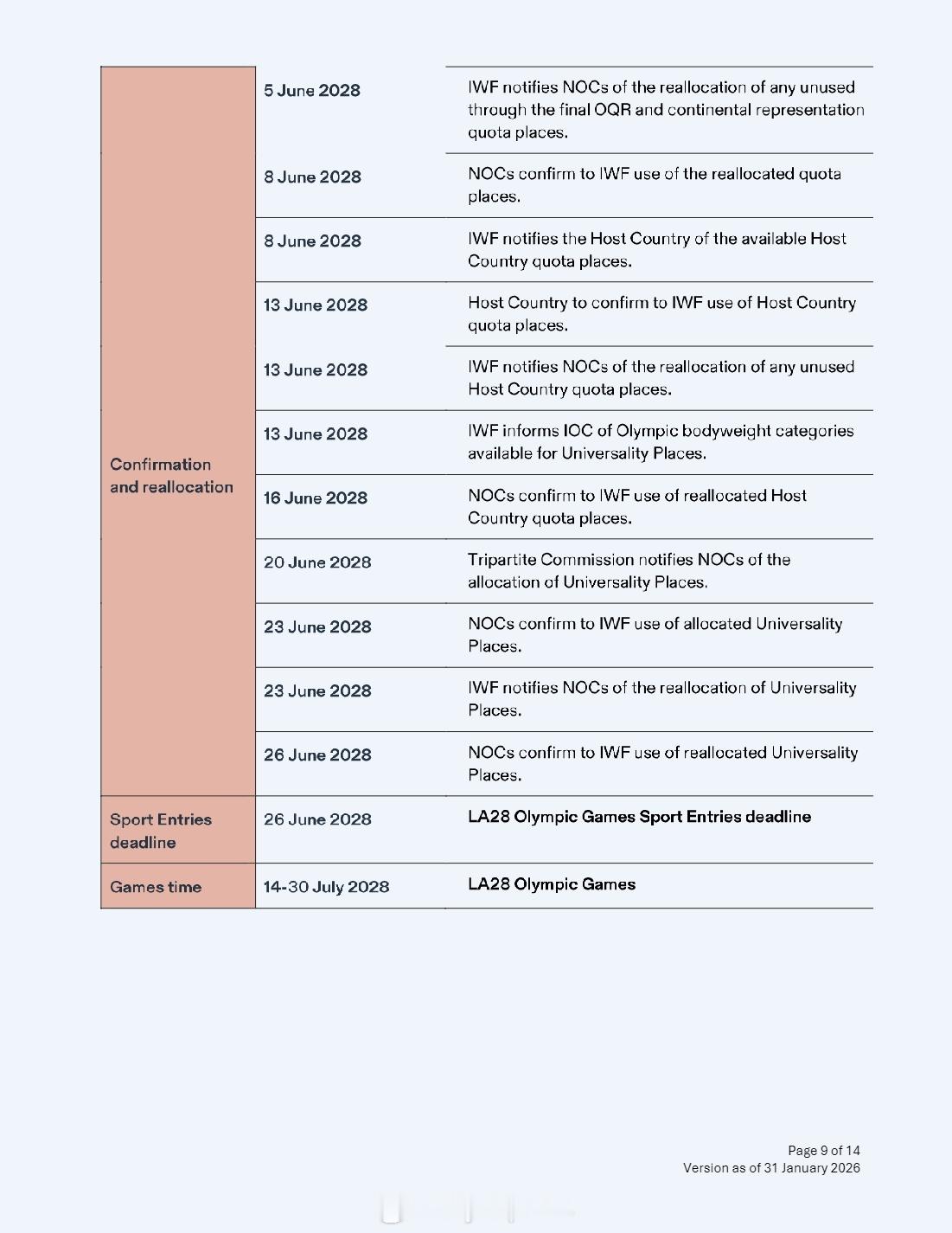 【洛杉矶奥运举重资格分配方案公布:满额6+2席】2028年洛杉矶奥运会国际体坛动态 2月1日,国际奥委会发布了2028年洛杉矶奥运会举重资格分配方案。举重共设男女各6个级别共12枚金牌,每个级别最多10名运动员参赛,共计120人。各协会每个级别最多1人参赛,最多可获得男女各3+1个满额共6+2个席位。参赛席位根据两个阶段的奥运积分赛颁发,各级别抓举+挺举总成绩积分前八的选手直通奥运,未拿到席位的大洲协会在各级别排名最高的选手获得1席。奥运积分赛结束后,国际举联将公布全部级别中最佳男女运动员各1人,并授予其所属协会一个奥运席位,如果该协会此前已经获得满额3席,将额外获得1席,即最多男女各4人参赛。