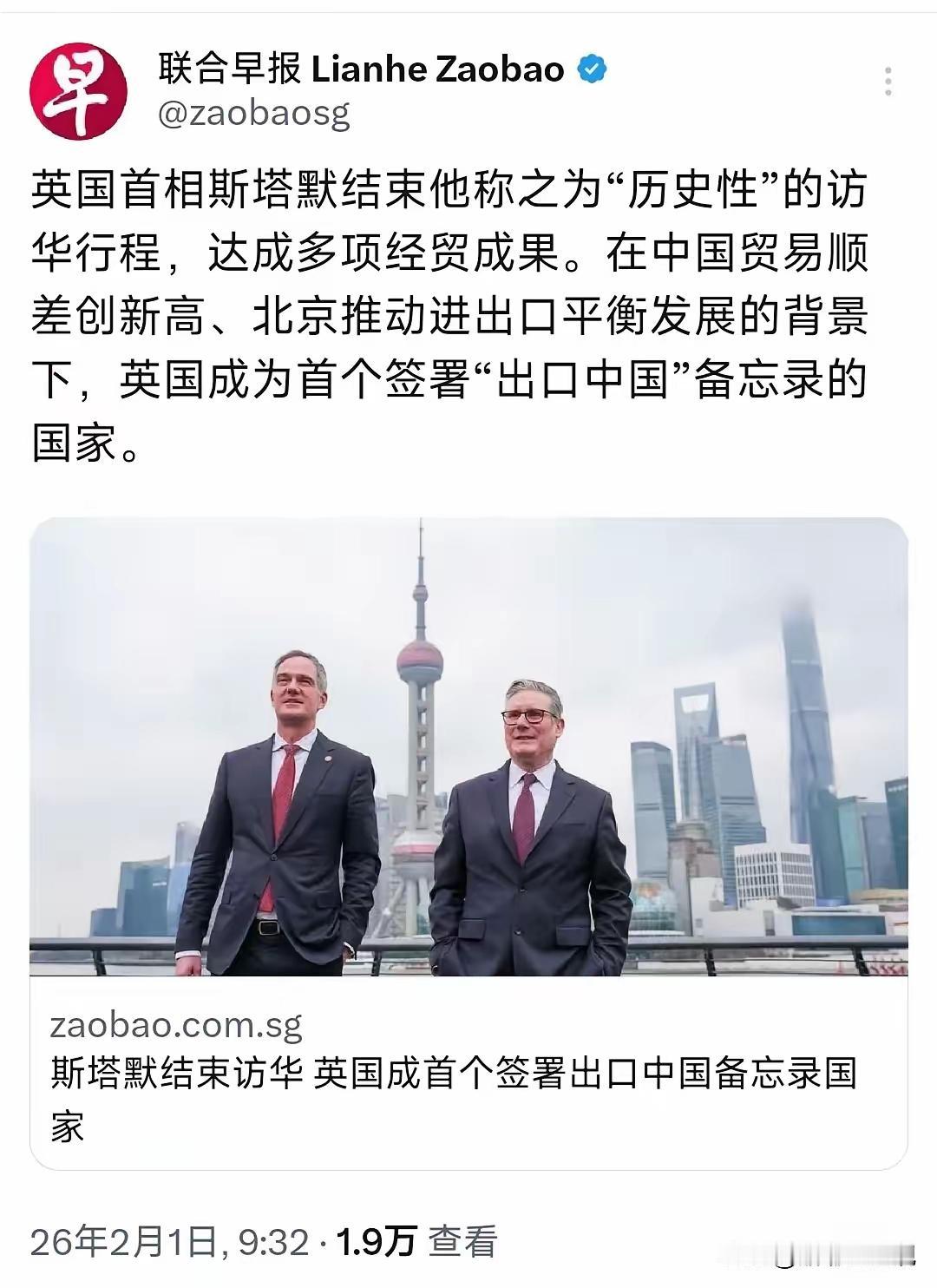 新加坡联合早报:英国成为首个签署“出口中国”备忘录的国家。 喷两句:英国首相访华,中英两国签了四项经贸成果文件。其中,《关于开展“共享大市场·出口中国”合作的谅解备忘录》的签署意义重大,根据备忘录双方将建立合作机制,挖掘英方优质商品和服务对华出口潜力。 做生意讲究个平衡,有钱一起赚。随着中国贸易顺差再创新高、中国也有意推动进出口平衡发展。只要你有好东西又肯卖,中国就愿意买。“共享大市场·出口中国”备忘录就体现了中国扩大高水平开放的决心,期望看到更多的英国好东西进入中国。