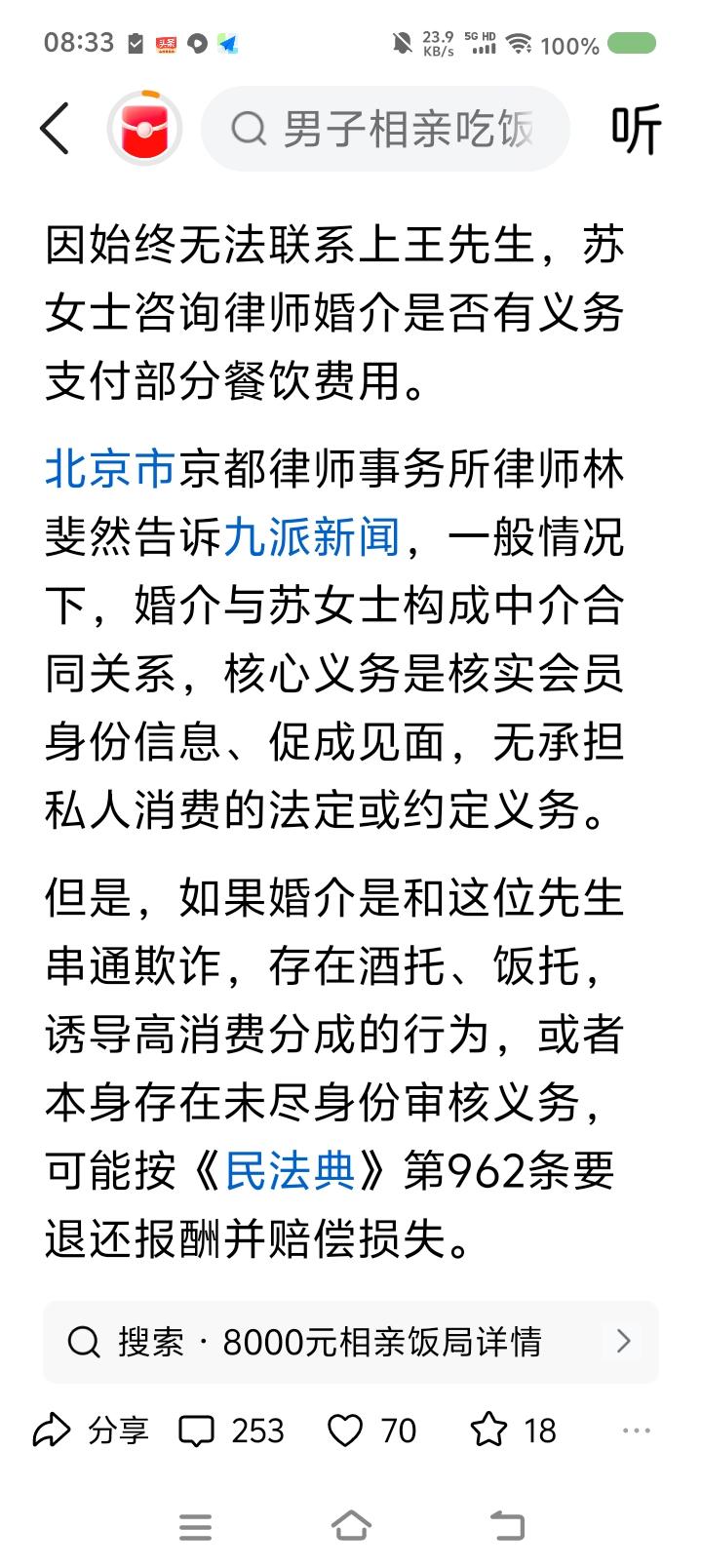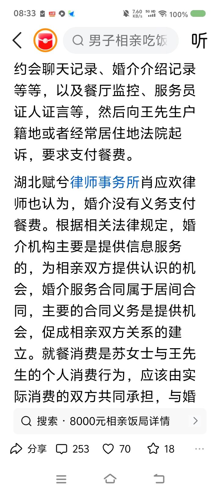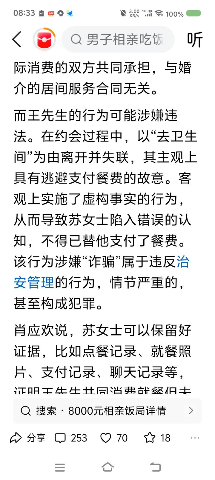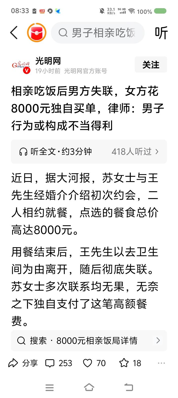 这都什么人?—— 据报道,一女子经婚介搭线,与男子初次约会,相约点餐,8000元。 用餐结束,男子失联。女方无奈,付款。她咨询律师,婚介是否应承担部分费用。 点评: 一、有人问:“谁点的?” 这个问题重要么? 律师认为,关键有两点:第一,有无欺诈?第二,如果无欺诈,男子应支付部分费用,不应逃单。 二、我在想,现在的人这么有钱了?约会,首次约会,点了8000元的餐? 是不是我不适合在中国生活了?为啥我觉得三百五百都算不小的开支了? 嫦娥姐姐,带我去天上,我怕冷,带我去一个有山有水不潮不燥不冷不热空气清新的地方!
