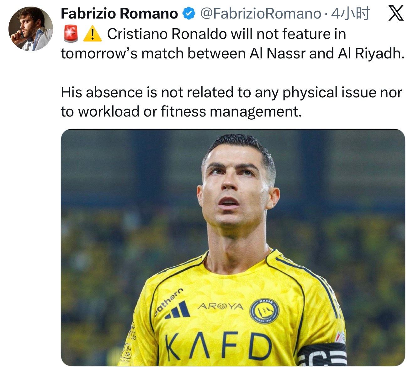 罗马诺:🚨⚠️克里斯蒂亚诺·罗纳尔多将不会参加明天利雅得胜利与利雅得体育之间的比赛。