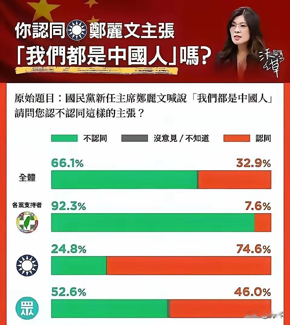 郑丽文的观点台湾人真的都支持吗?有些事我们不能太想当然 第1张图是关于郑丽文提出的两岸都是中国人这一观点的民调。实打实的说,从数据上来看,相当一般。整体的支持率仅仅只有32.9%。 要知道,这还不是谈统一问题,只是谈两岸都是中国人同根同源同文化这个事。就连如此大的一个范畴,台岛连一半的认同感都没有。这就足以说明,在对待台岛对待统一的一些问题上,我们确实不能想当然。 有些媒体对外报道,说台岛民众现在已经开始越来越多的谈论回归和统一相关的话题了。我相信这种现象在台岛的一些地区有可能确实存在,但是大概率不是全台岛的普遍现象。因为如果大家都在谈论统一这个话题的话,那么郑丽文早就已经开始大谈统一和回归了,而不是像现在这样,只是提到加强交流合作认同两岸都是中国人,但尽可能的回避统一回归这样的敏感字眼了。 尽管我们祖国的统一大业必定会完成,但是有一个客观的事实,我们必须要关注到,那就是台岛毕竟在1945年之前被日本整整统治了半个世纪,毕竟在1945年之后一直被非法政权统治。毕竟,已经好几代人过去了,接受的理念,灌输的思想和大陆是有着很大的不同的。所以我们想当然的一些事情在台岛民众看来,并不见得是认同的。