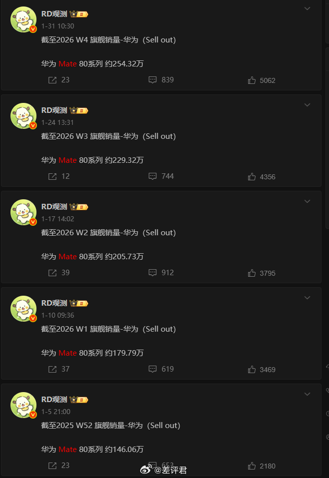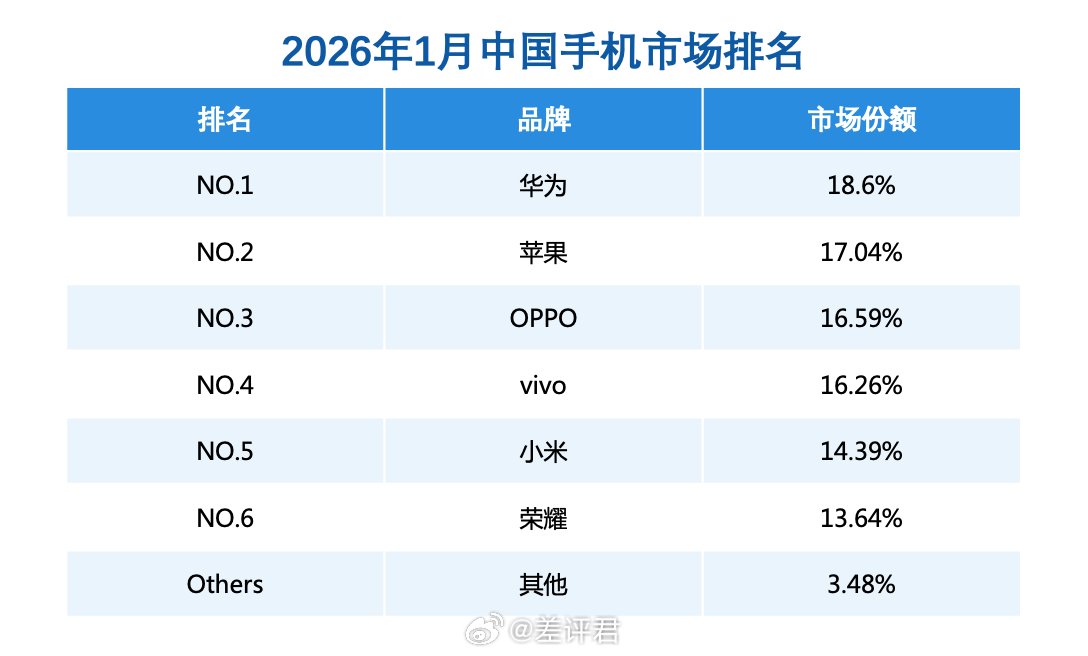 #差评说数码# 1月份华为又来到了国内手机市场份额第一(18.6%),而且 Mate 80 系列的后续销量还挺稳定的,整个 1 月份还卖出了 100 多万台,已经比 Mate 70 同期要好了。接下去又是华为的春节优惠,感觉还能再冲一波销量