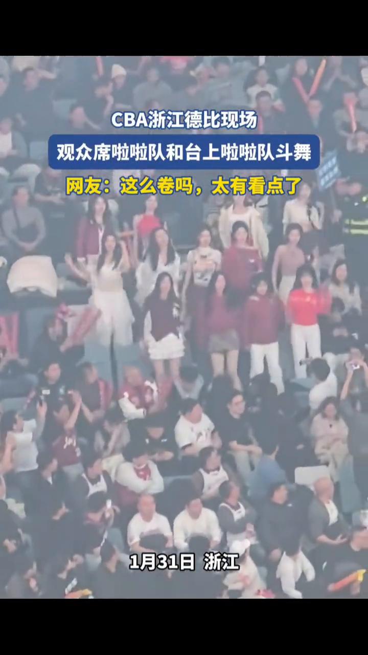 CBA浙江德比现场,观众席啦啦队和台上啦啦队斗舞。 网友:这么卷吗?太有看点了。 1月31日浙江,子篮球职业联赛(杭州赛区)。