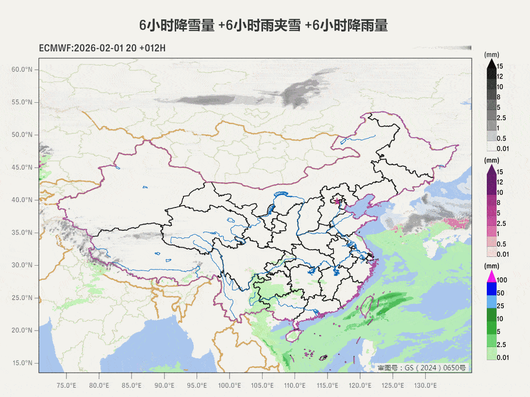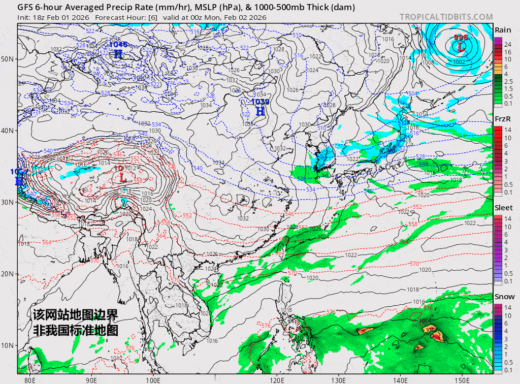 1、降水2月2-3日,我国大部地区是晴天为主,在西藏、新疆部分地区有降雪。2月4日-5日晨,新疆北部、内蒙古东部、吉林、黑龙江降雪增多。之后随着冷空气继续东移南下,配合暖湿气流,在淮河以南多地,5-6日会出现一轮大范围降水。图1为官方报降水、图2-3为欧美数值预报的降水。