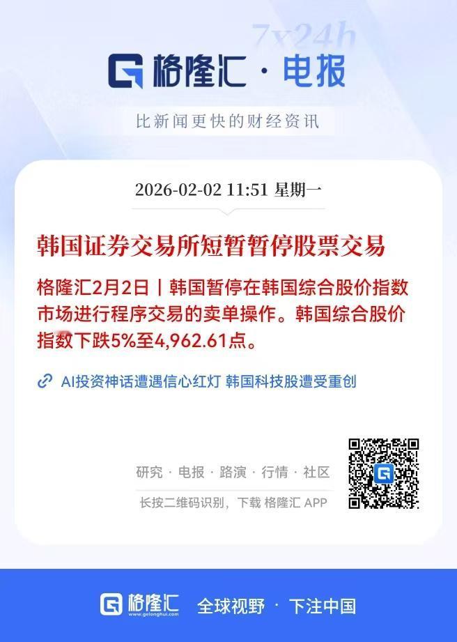 完了!全球都在杀跌,韩股都直接跌的暂停交易了,下午A股危险了。 金银依然在止不住的跌,原油也大跌,韩国股市暴跌超5个点,直接采取暂停交易的措施了。 A股收盘后,港股依然持续下挫,港股恒生指数直接把一月份的涨幅跌没了,跌了3.68%, 2月开盘就这么杀跌,真的有点狠。 上午明显有资金想拉小微盘,但是拉上去后,发现接力的不够,又下来了。 现在外围跌成这样,A股难免会受影响了。 下午不会开盘就溜吧?
