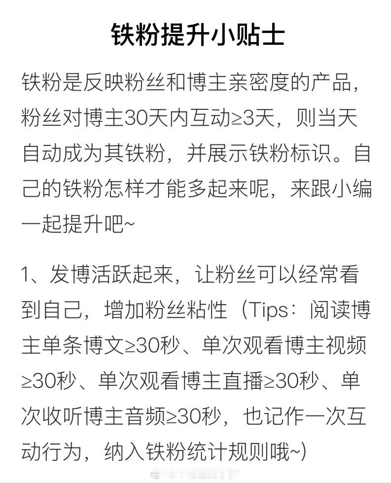 Tips:阅读博主单条博文≥30秒、单次观看博主视频≥30秒、单次观看博主直播≥30秒、单次收听博主音频≥30秒,也记作一次互动行为,纳入铁粉统计规则。