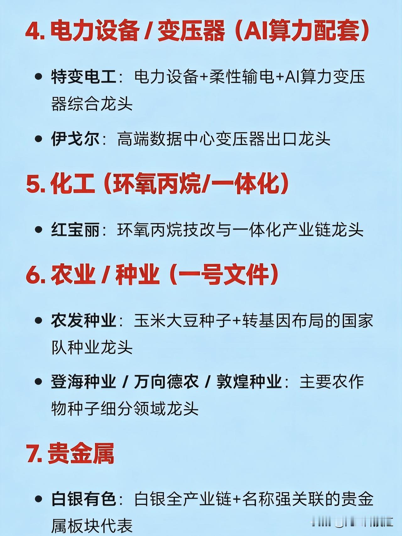 2026年2月2日十大热点概念核心企业 1. AI应用 天地在线:AI营销与虚拟数字人全链条服务龙头 蓝色光标:AI营销领域代表性企业 利欧股份:AI应用 + 液冷服务器双赛道布局领先者 2. 光通信 / CPO(共封装光学) 通鼎互联:光通信产业链完整、运营商合作深入的龙头企业 亨通光电:光纤光缆与光模块综合龙头 新易盛:CPO与高速光模块核心供应商 中际旭创:全球AI算力光模块龙头 3. 人形机器人 / 具身智能 天奇股份:人形机器人规模化落地(比亚迪、富士康等)+ 锂电池回收双龙头 银河通用机器人:春晚指定具身大模型机器人厂商 4. 电力设备 / 变压器(AI算力配套) 特变电工:电力设备+柔性输电+AI算力变压器综合龙头 伊戈尔:高端数据中心变压器出口龙头 5. 化工(环氧丙烷/一体化) 红宝丽:环氧丙烷技改与一体化产业链龙头 6. 农业 / 种业(一号文件) 农发种业:玉米大豆种子+转基因布局的国家队种业龙头 登海种业 / 万向德农 / 敦煌种业:主要农作物种子细分领域龙头 7. 贵金属 白银有色:白银全产业链+名称强关联的贵金属板块代表 湖南黄金 / 赤峰黄金 / 山东黄金等:黄金采选与冶炼龙头 8. 新型储能 / 容量电价政策受益 阳光电源:全球储能系统出货龙头 南网储能:电网侧独立储能运营平台龙头 9. 半导体 / 原子级制造 寒武纪:AI芯片国产化龙头,2025年扭亏 平头哥(阿里系):PPU芯片出货领先 德尔未来 / 国林科技:原子级制造装备与材料潜在龙头 10. 商业航天 / 太空经济 长江通信 / 天通股份:卫星通信与航天配套设备龙头
