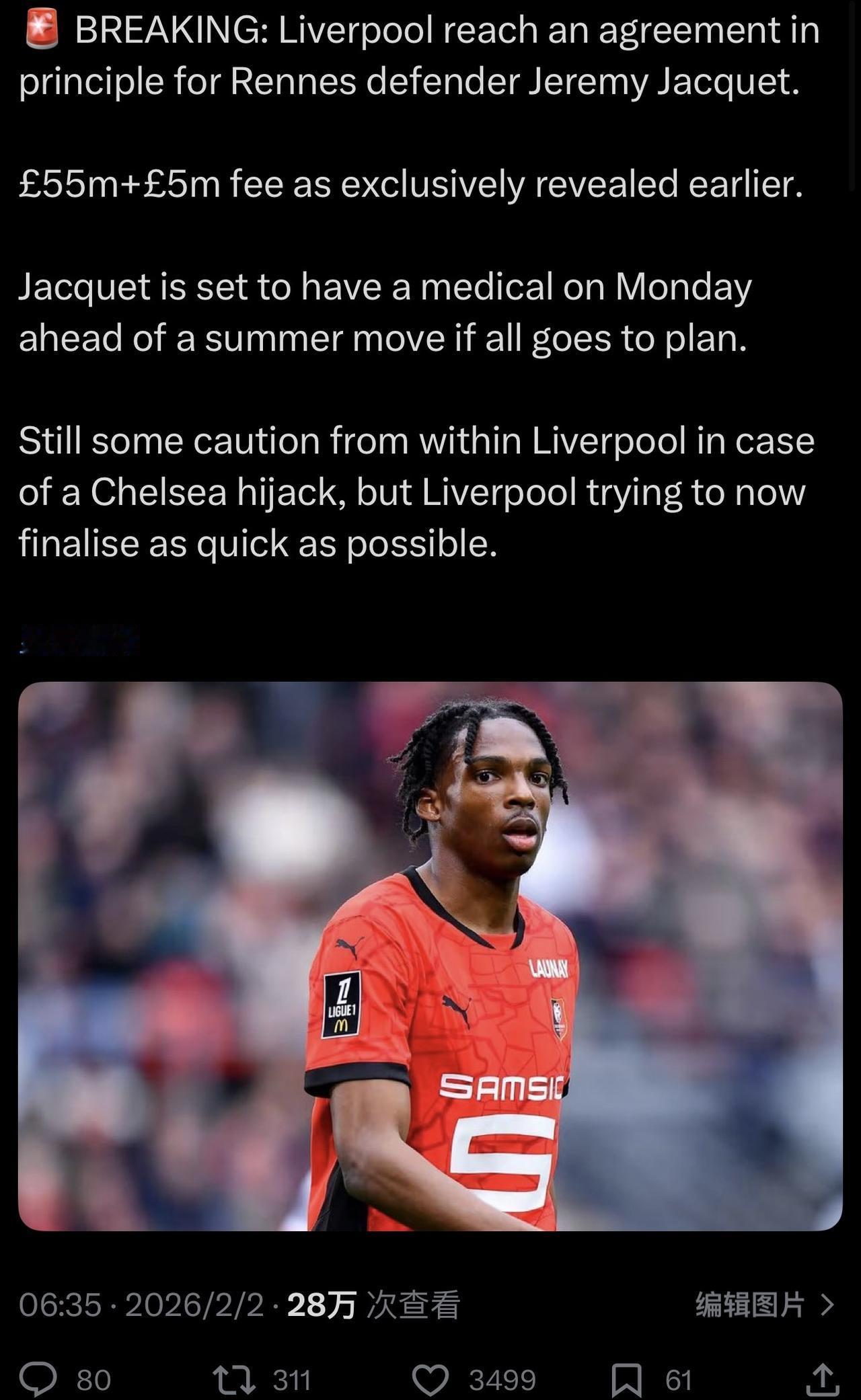 我很好奇,曼联之前要截胡雅凯的这种消息,怎么会出现在的。 阿莫林352时代,曼联都不需要再买中卫了,何况是现在? 如今的曼联,什么都缺,就是不缺中卫。替补席上,还有约罗,海文。医务室内躺着德里赫特。 卢克·肖 能踢左中卫,马兹拉维也能凑活右中卫。 哪怕4线作战都绰绰有余[捂脸], ……………………………………………………………… 利物浦与雷恩就后卫杰里米·雅凯的转会达成原则性协议。 此前独家披露的金额为5500万英镑+500万英镑费用。 如果一切顺利,雅克将于周一接受体检,之后将在夏季转会。 利物浦内部仍然有些谨慎,担心切尔西会趁机截胡,但利物浦现在正试图尽快完成这笔交易。