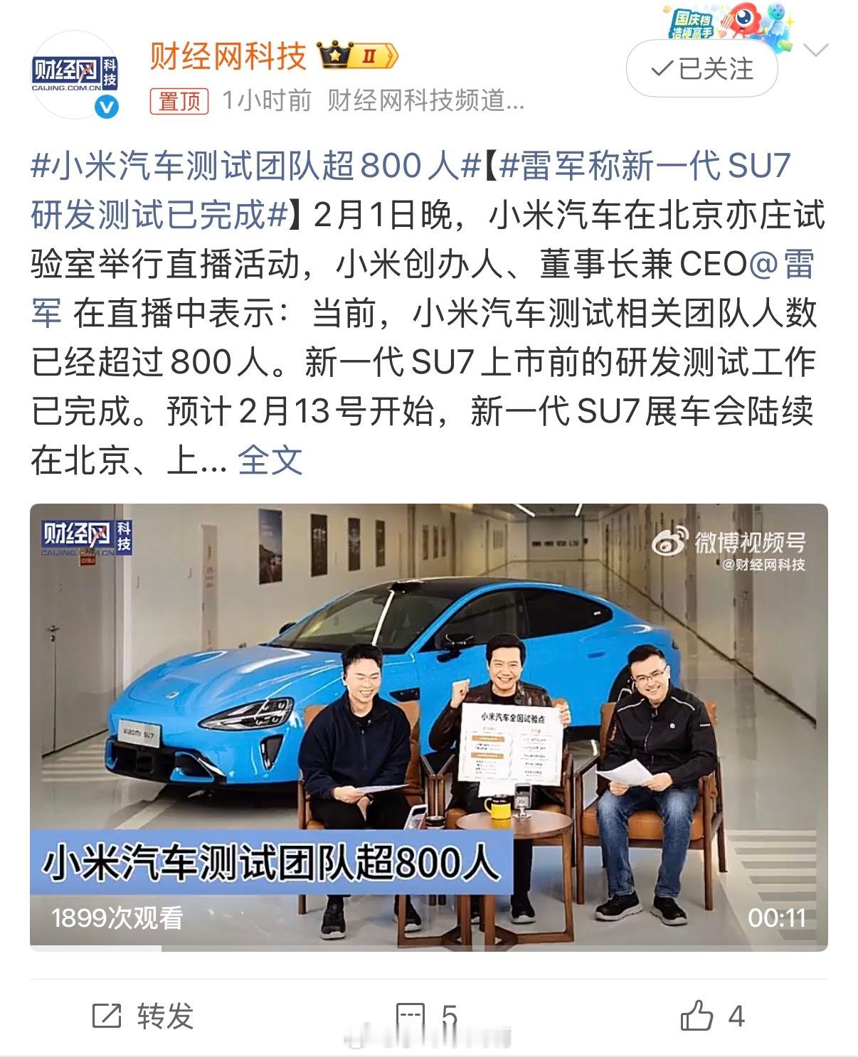 2月1日晚,雷军在小米汽车北京亦庄试验室的直播里透露:目前小米汽车的测试团队已超800人,而万众期待的新一代SU7,所有上市前的研发与测试工作,已经全部搞定。小米汽车测试团队超800人