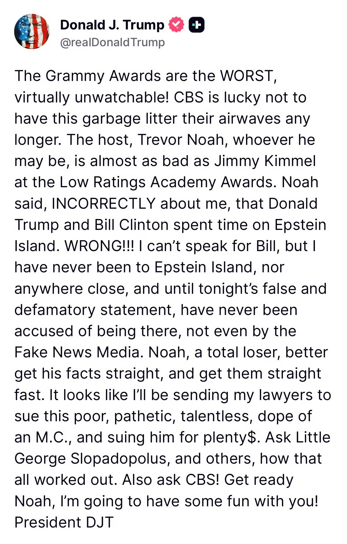 特朗普大骂“格莱美奖”烂到不堪入目,说主持人特雷弗·诺亚散布关于其与爱泼斯坦岛的不实指控,相关说法虚假且构成诽谤,要起诉 。