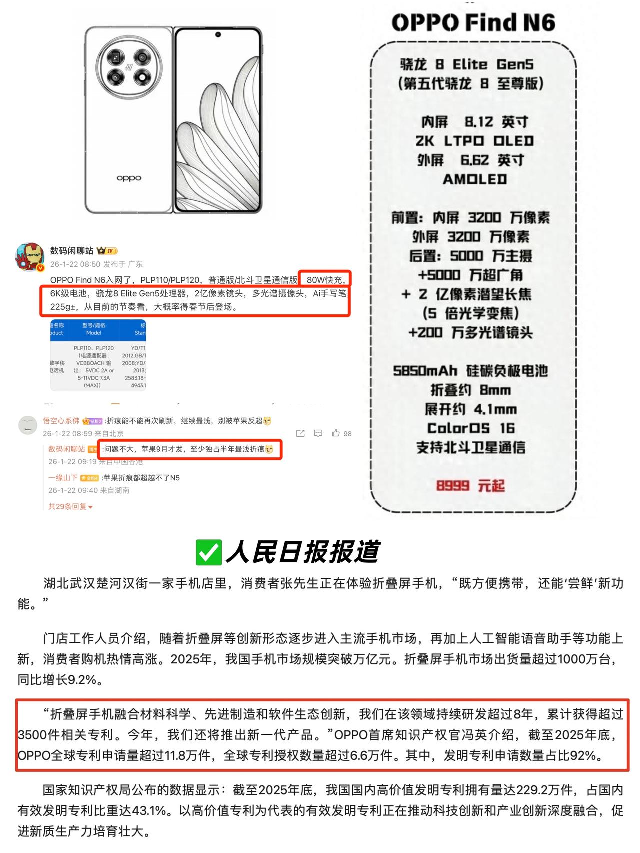 这不就是翻版Find N?苹果折叠屏真长这样? 🍎果粉盼星星盼月亮终于把第一款折叠机盼来了? 看爆料,iPhone Fold基本已经定型了,外屏5.49英寸+内屏7.74英寸,展开近乎iPad mini,展开看着像个小宽屏,比例像极了四年前的Find N,都是小胖子🤔 👀具体细节上,iPhone Fold电源键据说放顶部还集成了指纹识别,背面摄像头横着摆,跟iPhone Air差不多。最关键是说正面据说能做到无折痕效果,看爆料是用了和OPPO Find N5同源的技术?难怪之前传言苹果买Find N5研究,果然越看越眼熟... ❗️不过我听说OPPO年后就要上Find N6了?听说这次也是冲着“无折痕”去的,而且这技术优势至少能独占半年👍还刷到人民日报报道折叠屏的消息,其中也提到了OPPO,这今年折叠屏大年的消息还真不是吹的~ - Find N6其他配置堆料也挺狠的: 🚀骁龙8 Elite Gen5处理器 ⚡️80W闪充➕接近6000mAh电池 📷2亿像素主摄➕多光谱摄像头 ✍️支持AI手写笔 ⚖️重量居然只有225克左右 - ⚠️要是真机真能如此,今年的折叠屏赛道就真的精彩了…… 大家会等iPhone Fold还是冲Find N6? 看站哥说Find N6大概率春节后登场,看来要抢先iPhone Fold实现“无折痕”了 折叠屏苹果OPPO Find N6iPhone Fold