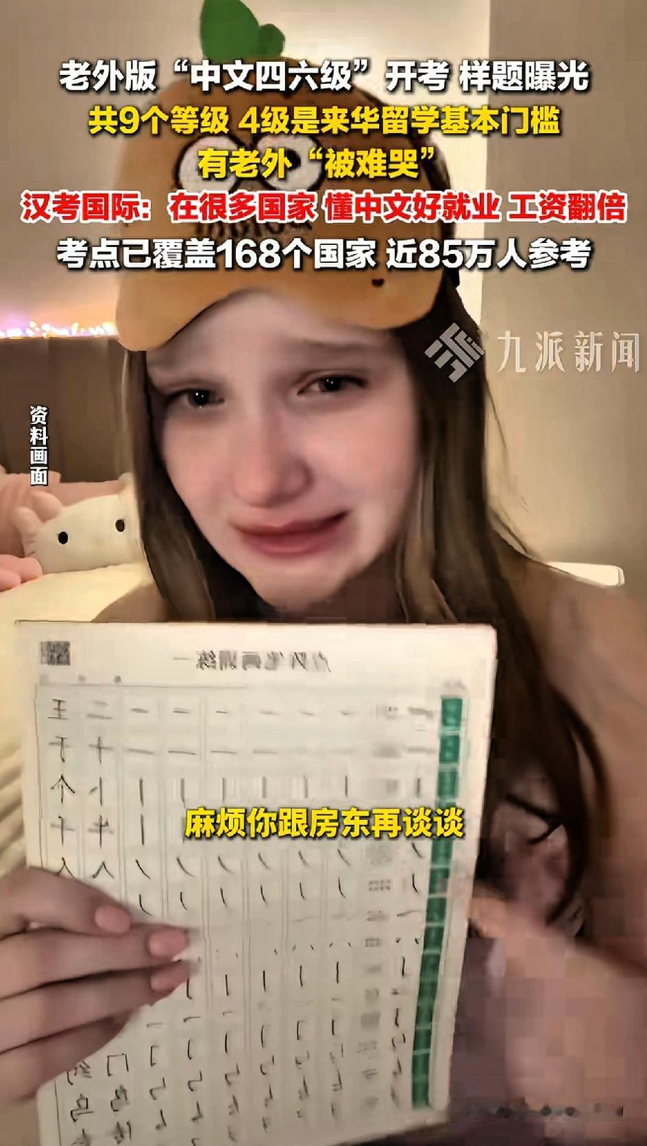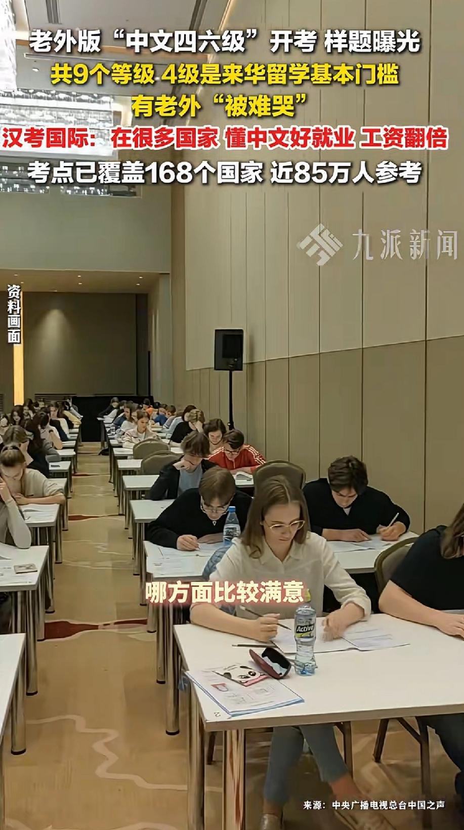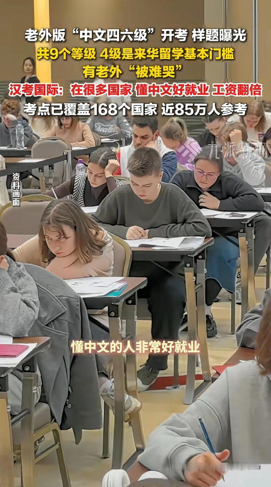 终于轮到老外考中文四六级了。汉考国际:在很多国家懂中文好就业,工资翻倍。 现在好多国家懂中文可太吃香了,会中文工资都能翻倍。想想就觉得有趣,中文这么博大精深,那些老外学起来估计得头大。也让老外体会一下语言课。 就说中文里的多音字、成语、诗词啥的,没点文化底蕴还真搞不定。比如“行”这个字,“行动”和“银行”里读音都不一样,估计能把他们绕晕。全世界的人都卷,外国人学中文,中国人学外文,有的人会说多国语言。 不过这也说明咱中文影响力越来越大了,以后说不定满大街都是说着流利中文的老外,想想还挺有画面感的,感觉挺酷!