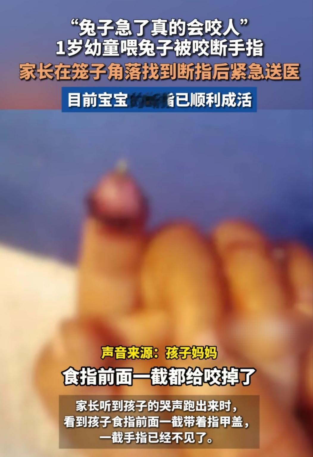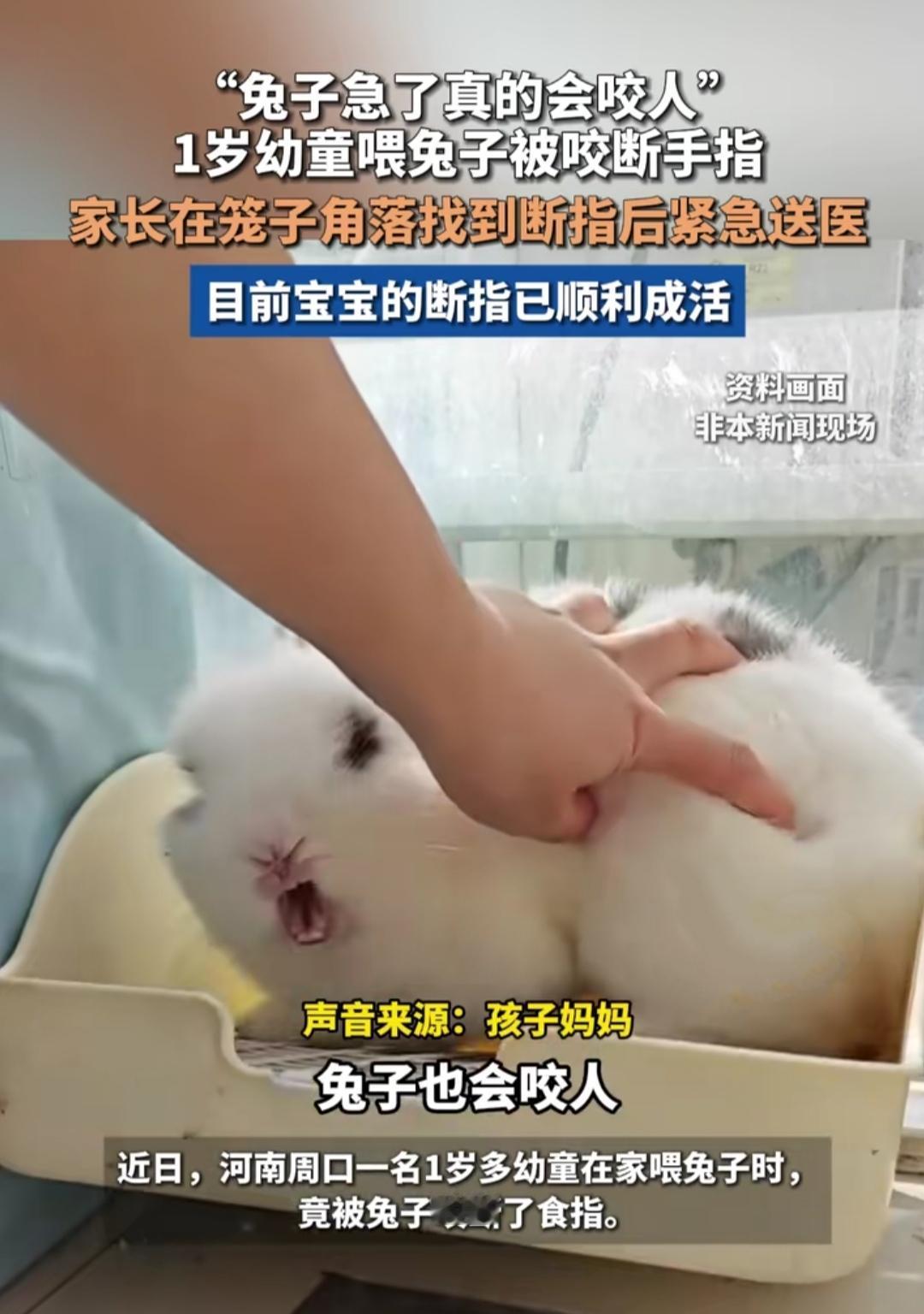 谁能想到软萌的小兔子,竟会让一家人揪碎了心!河南周口这事儿,看完真的忍不住捏把汗,家里有娃又养宠物的,估计都能体会这份后怕,养宠的温馨背后,藏着的意外从不让人提前准备。 1岁多的娃正是爱探索的年纪,趁爷爷奶奶在厨房做饭的空档,悄悄凑到兔笼边喂兔子,没成想稚嫩的食指竟被兔子咬断,孩子撕心裂肺的哭声,瞬间让整个家乱了阵脚。 家长发现后急得团团转,四处翻找断指,慌乱中还误以为被兔子吞下,好在最后在兔笼角落找到,赶紧抱着孩子往医院赶,万幸的是,经过救治,宝宝的断指顺利成活了。 娃的好奇心挡不住,小动物的本能也难预判,居家养宠的温馨日常里,总藏着这样猝不及防的意外。大人的一时疏忽,可能就酿成揪心的后果,其中的滋味,只有当爸妈的才懂。