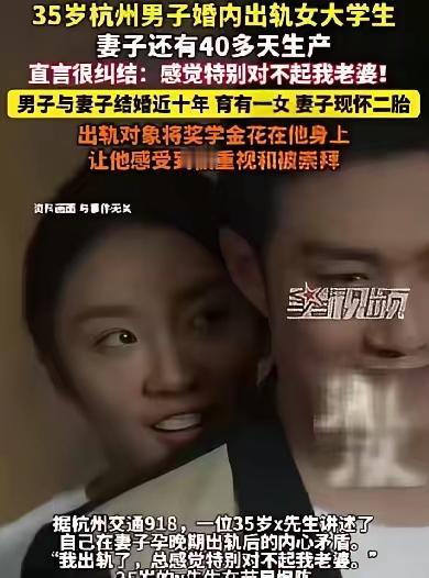 这样不忠不义的男人,留着干啥用? 杭州一男子,今年35岁,婚内出轨,对方是一名20岁的女大学生,对他崇拜有加,关心体贴,全身心付出,把自己的奖学金都给他买了礼物! 而他的妻子怀了二胎,再有40天就要生了,早就回老家待产了!妻子刚怀孕时,由于担心流产,俩人就不再进行亲密关系了。他寂寞难当,就去网上聊天解闷,没想到和20岁的女大学生一见如故,越聊越投机,越聊越难舍难分,于是俩人就奔了现,并发生了关系! 最初,女大学生并不知道他已婚生子的事,等到发现了,哭闹不已,但舍不得放手,决定追随他到底!可他心里有愧,既舍不得妻儿,又放不下女大学生,既想要家庭的温暖,又想要红颜知己的温柔! 内心纠结的他,将满腹心事放进了树洞倾诉,没想到火遍了全网!不管是男人女人,都觉得他做的不对。对妻子不忠,对女大学生不义,为了满足自己的私欲,辜负了相濡以沫的妻子;为了求得心灵的安宁,又暴露了忠心耿耿的情人! 这样不忠不义的男人,留着有什么用?不如两个女人都放弃他,让他尝一尝孤家寡人的滋味[笑哭][笑哭][笑哭]